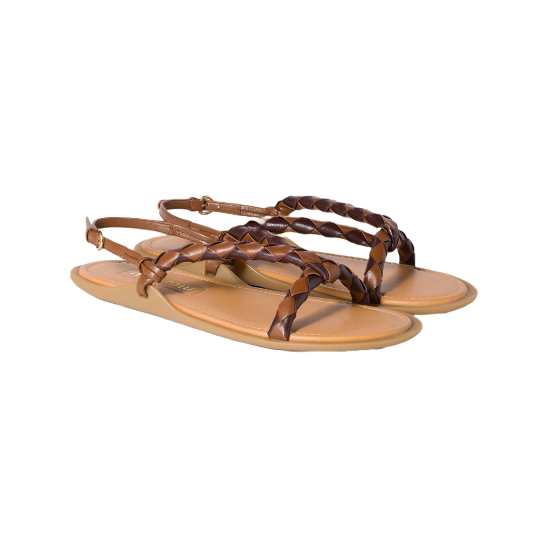 (W) Miu Miu Braided Leather Sandals Cognac Briarwood