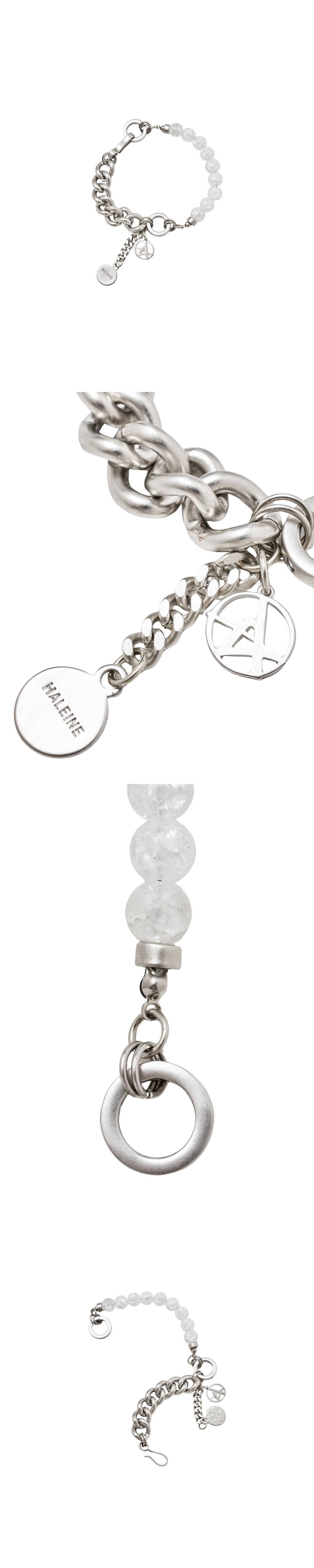 두꺼운 커브 체인과 무광 화이트 젬스톤 비즈를 이어 구성한 브레이슬릿입니다. 서로 다른 소재와 질감의 대비가 돋보이며, 브랜드 로고와 네임을 새긴 메탈 참이 포인트로 달려 있습니다. 볼드한 무드로 단독 착용만으로도 스타일링에 힘을 줄 수 있는 아이템입니다. *천연 원석 특성상 개체 차이가 있을 수 있는 점 참고 부탁드립니다.* - DETAIL - 로고 메탈 참