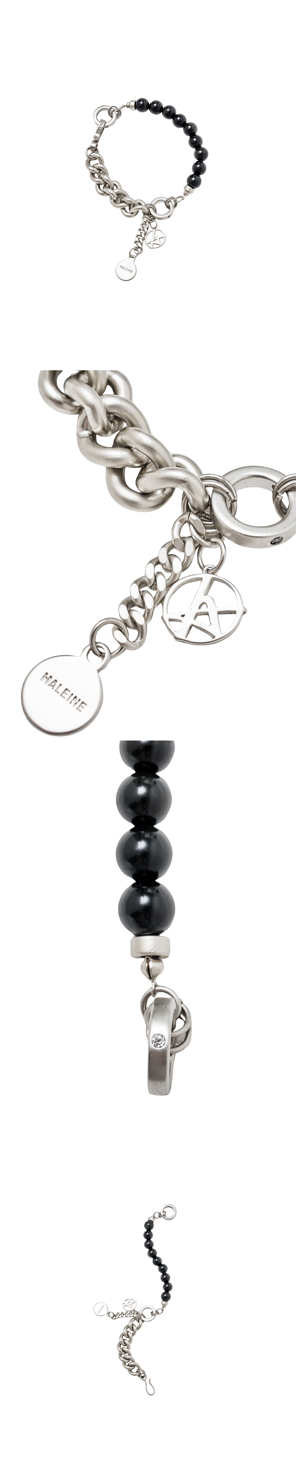 두꺼운 커브 체인과 유광 블랙 젬스톤 비즈를 이어 구성한 브레이슬릿입니다. 서로 다른 소재와 질감의 대비가 돋보이며, 브랜드 로고와 네임을 새긴 메탈 참이 포인트로 달려 있습니다. 볼드한 무드로 단독 착용만으로도 스타일링에 힘을 줄 수 있는 아이템입니다. *천연 원석 특성상 개체 차이가 있을 수 있는 점 참고 부탁드립니다.* - DETAIL - 로고 메탈 참