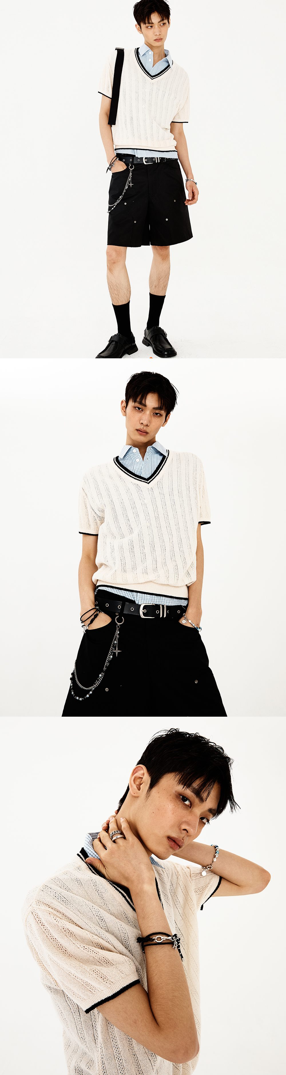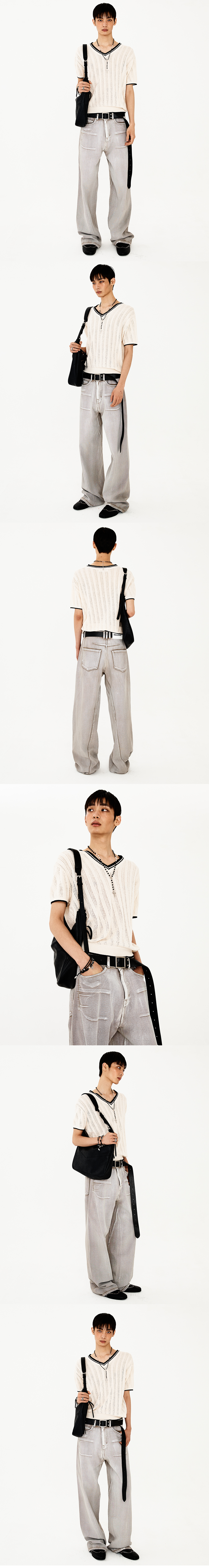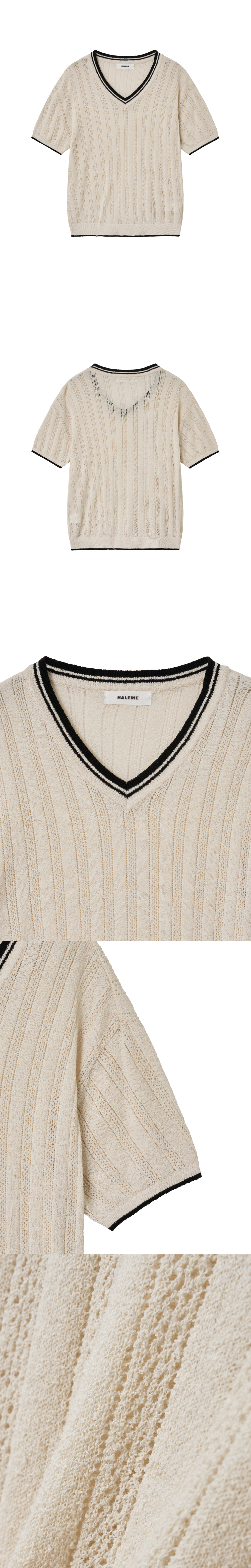 브이넥 라인과 배색 디테일이 돋보이는 반팔 부클 니트입니다. 소매와 몸판 전체에 세로로 펀칭 짜임이 들어가 있어 독특하고 세련된 느낌을 더하며, 여름철 시원하게 착용할 수 있는 얇은 부클 소재로 제작되었습니다. 브이넥, 소맷단, 밑단 시보리에 배색 디테일이 들어가 있어 스타일리시한 포인트를 제공합니다. 부드럽고 가벼운 소재로 레귤러핏이 편안한 착용감을 제공합니다. -DETAIL- 레귤러 핏 넥라인 및 소맷단, 밑단의 배색 디테일 소매와 몸판 전체에 들어간 펀칭 짜임 -model- 186cm / 가슴둘레 83cm / 허리둘레 70cm / 엉덩이둘레 90cm - 2사이즈 착용