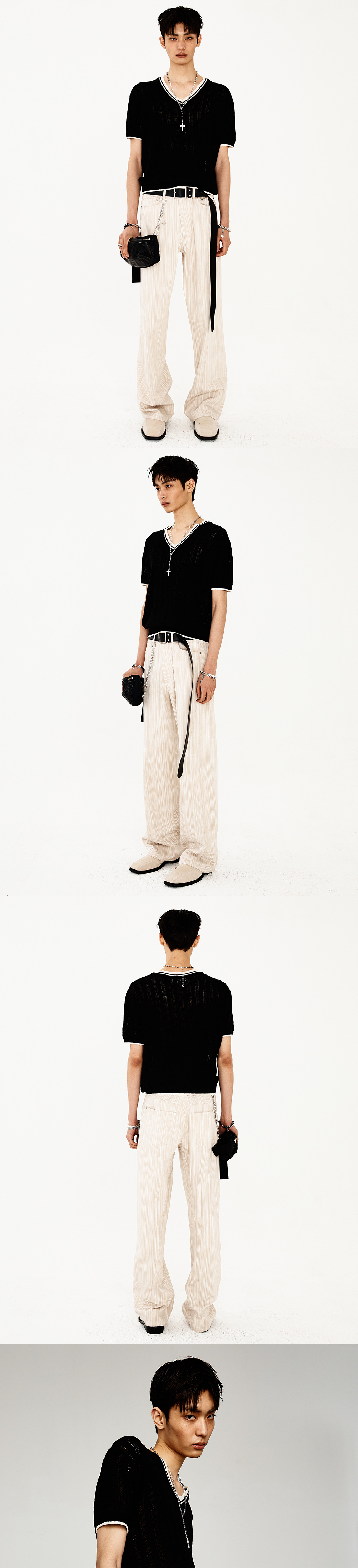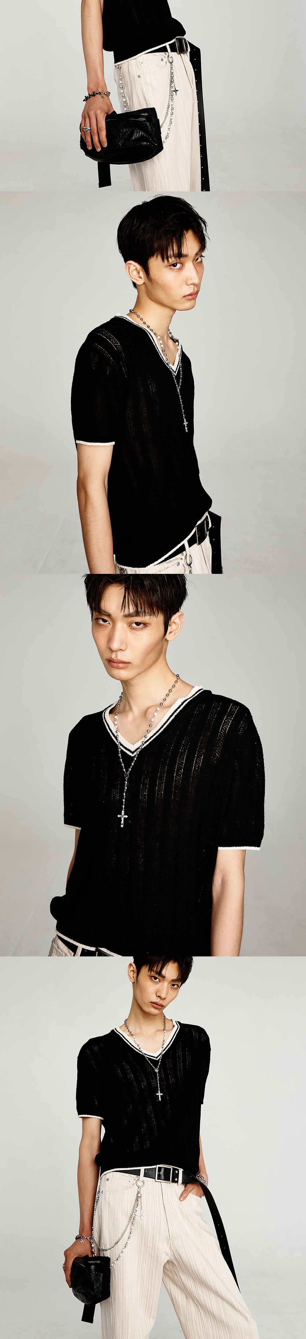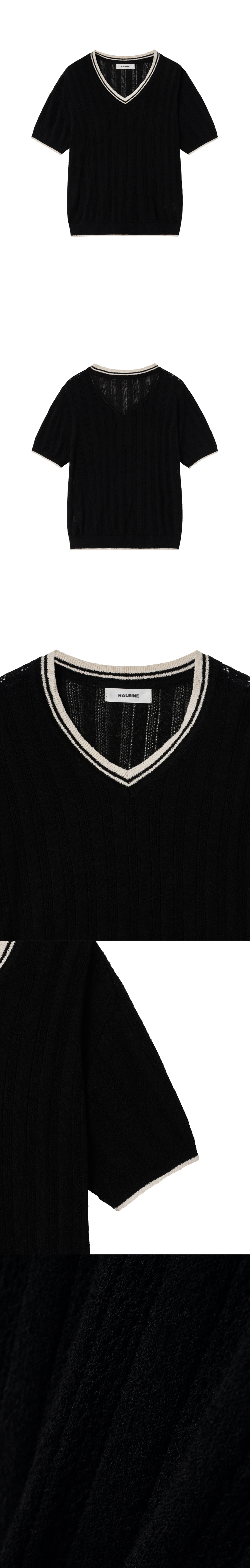 브이넥 라인과 배색 디테일이 돋보이는 반팔 부클 니트입니다. 소매와 몸판 전체에 세로로 펀칭 짜임이 들어가 있어 독특하고 세련된 느낌을 더하며, 여름철 시원하게 착용할 수 있는 얇은 부클 소재로 제작되었습니다. 브이넥, 소맷단, 밑단 시보리에 배색 디테일이 들어가 있어 스타일리시한 포인트를 제공합니다. 부드럽고 가벼운 소재로 레귤러핏이 편안한 착용감을 제공합니다. -DETAIL- 레귤러 핏 넥라인 및 소맷단, 밑단의 배색 디테일 소매와 몸판 전체에 들어간 펀칭 짜임 -model- 186cm / 가슴둘레 83cm / 허리둘레 70cm / 엉덩이둘레 90cm - 2사이즈 착용
