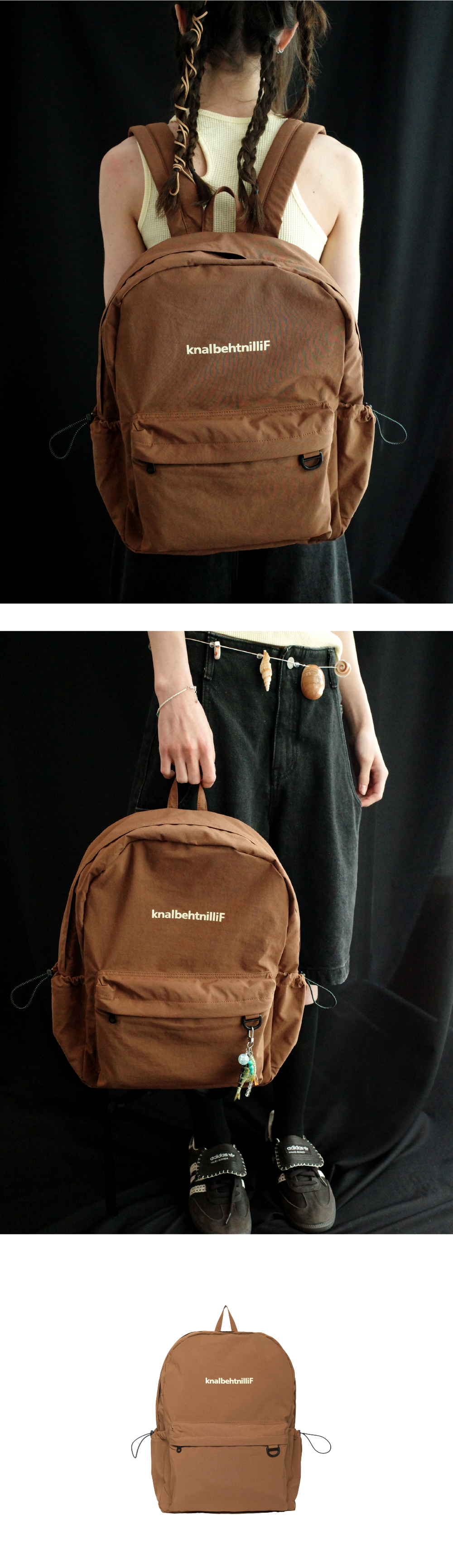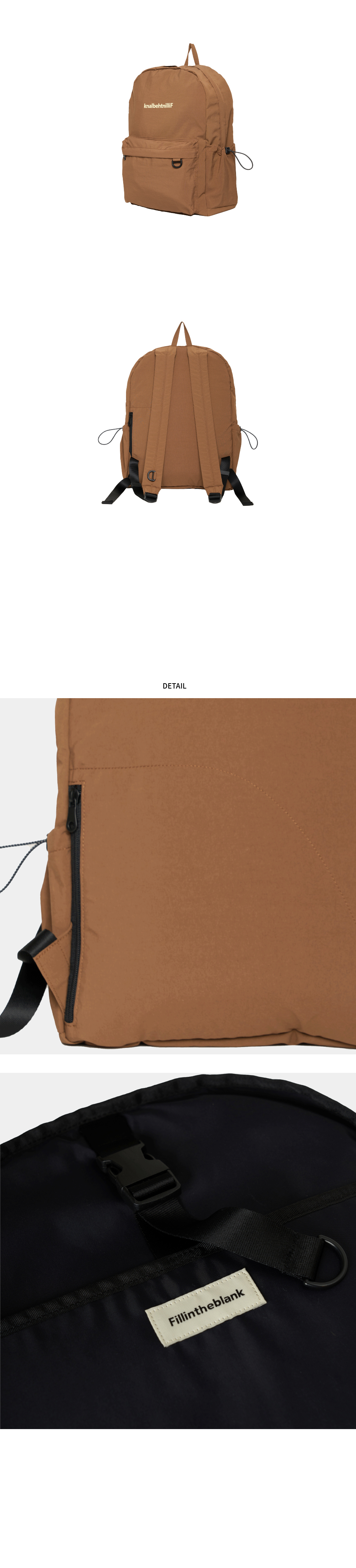 가볍고 실용적인 나일론 소재의 데일리 경량 백팩 · 15인치 노트북 전용 내부 수납 칸 · 후면에 실용적인 히든 포켓 추가 · 넉넉한 전면 포켓 · 키링등 연출 가능한 전면부 포켓 위 D링 디테일 · 실용성과 스타일 연출이 가능한 스트랩 D링 디테일