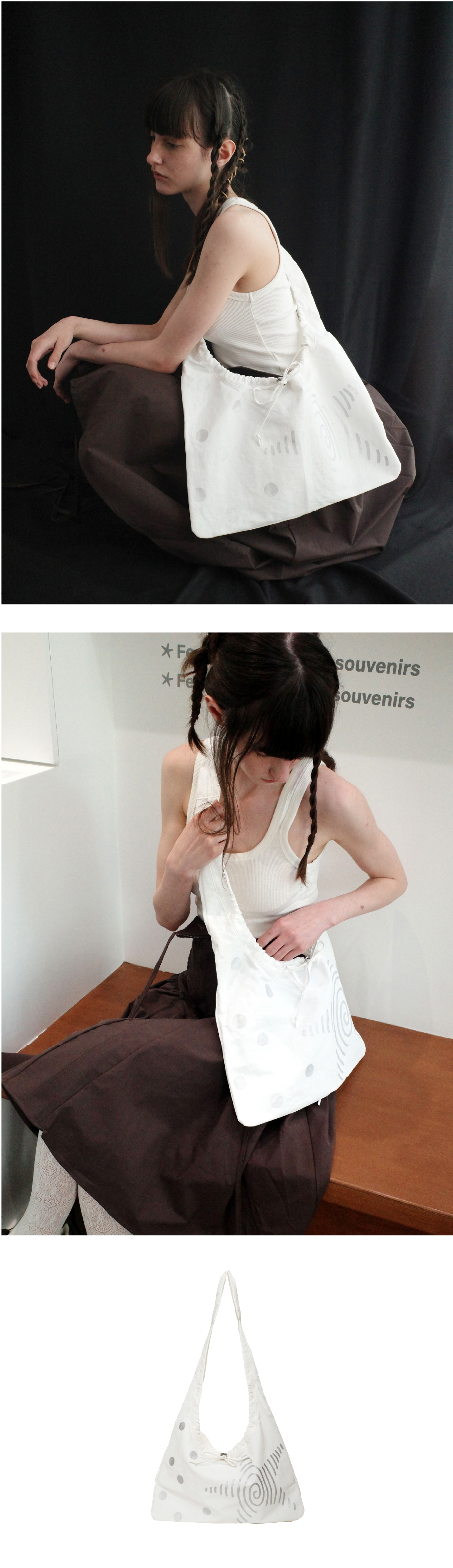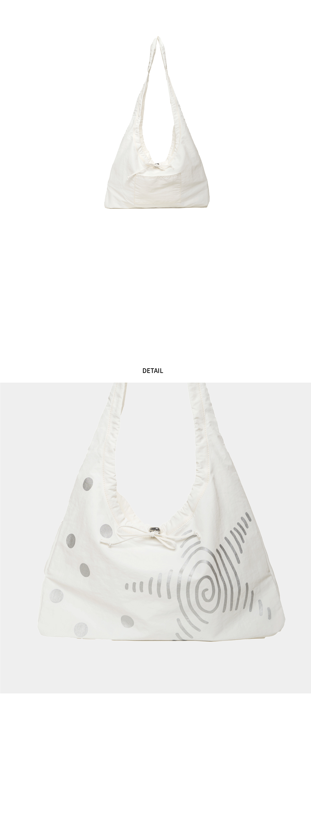 스토퍼로 실루엣 변형이 가능한 가벼운 소재의 멀티백 · 크로스백으로도 착용 가능 · 입구 부분의 스트랩을 변형하여 실루엣 DIY 가능 · 후면부 포켓 · 전면 프린팅 은은한 메탈감의 실버 컬러 프린팅 · 발수 코팅된 나일론 원단 · 15인치 노트북 수납 가능