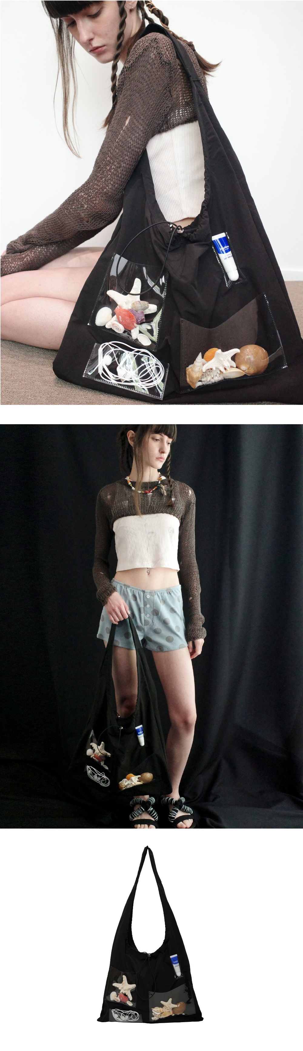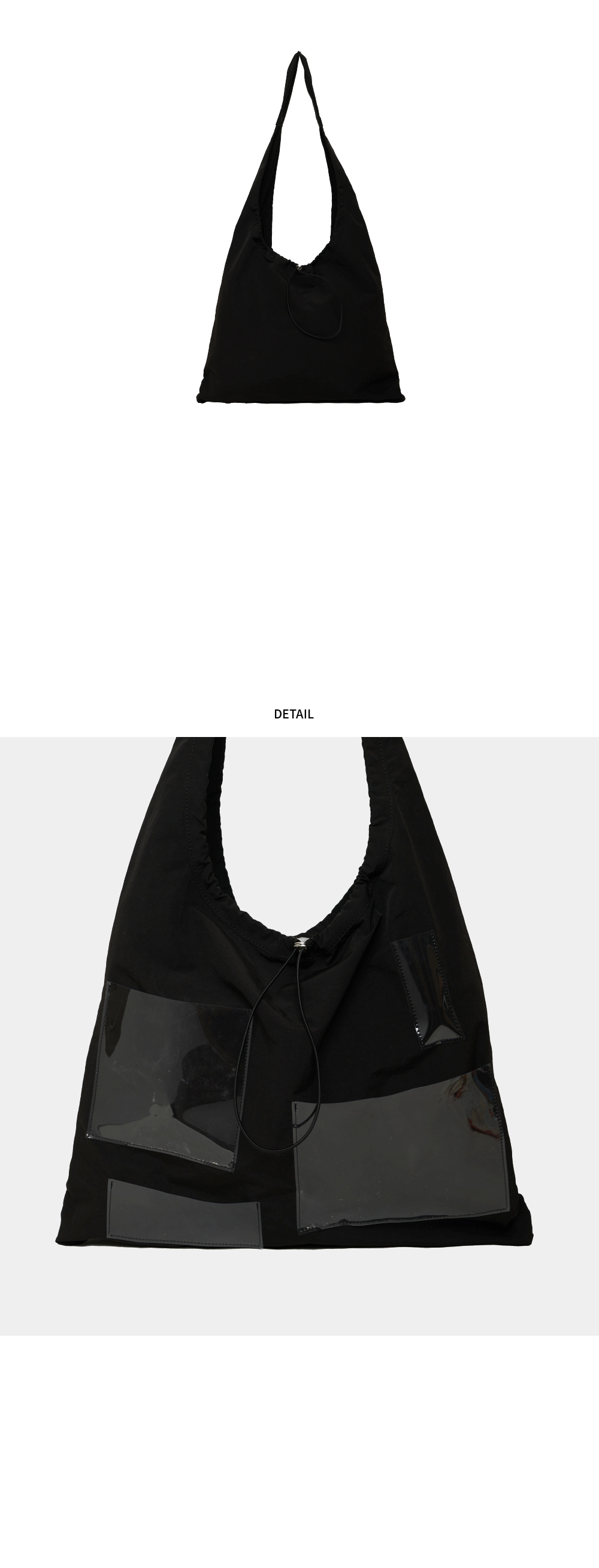 스토퍼로 실루엣을 조절할 수 있는 가벼운 소재의 멀티 백. · 앞면 클리어 PVC 포켓으로 나만의 DIY 가능 · 전 / 후면 전체 엘라스틱 스트링 · 발수 코팅된 나일론 원단 · 15인치 노트북 수납 가능