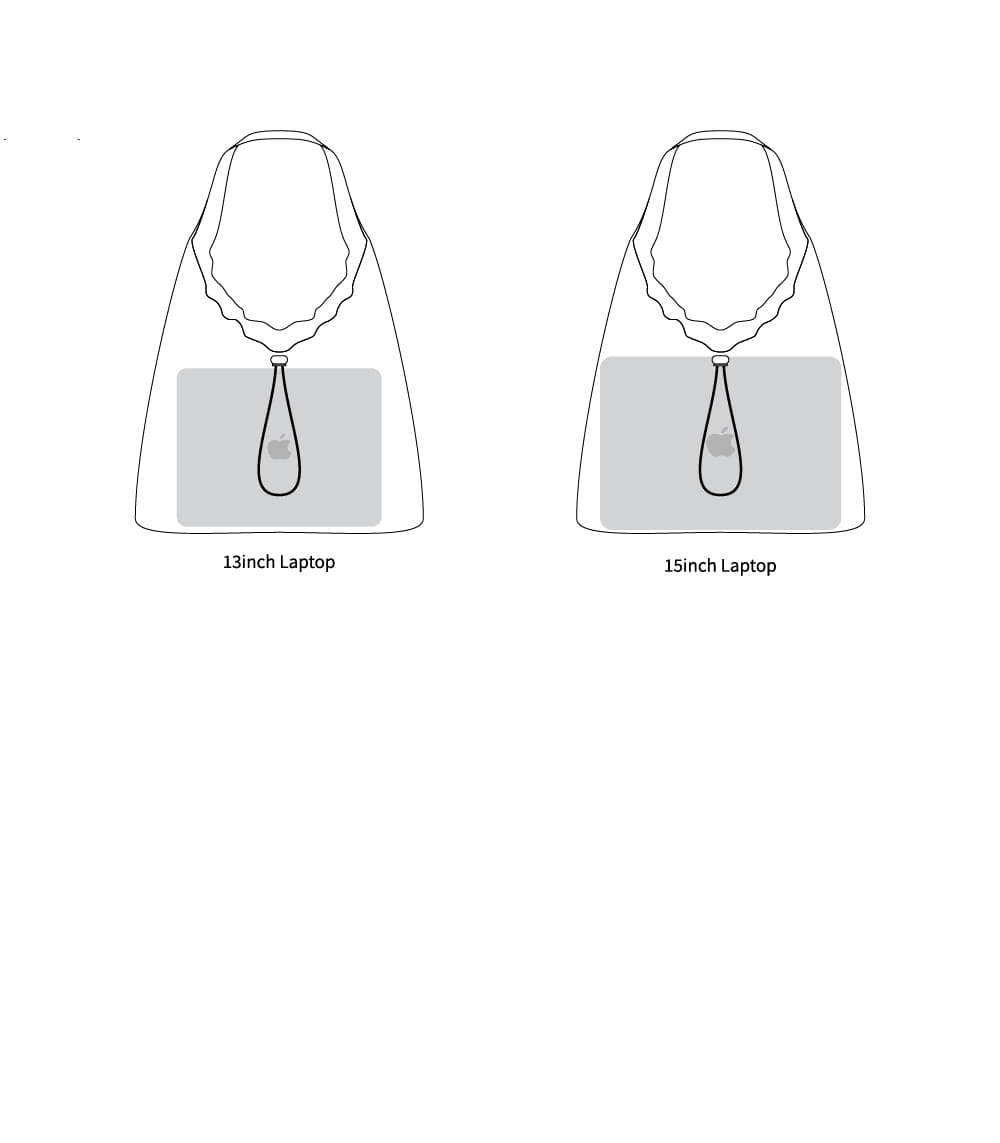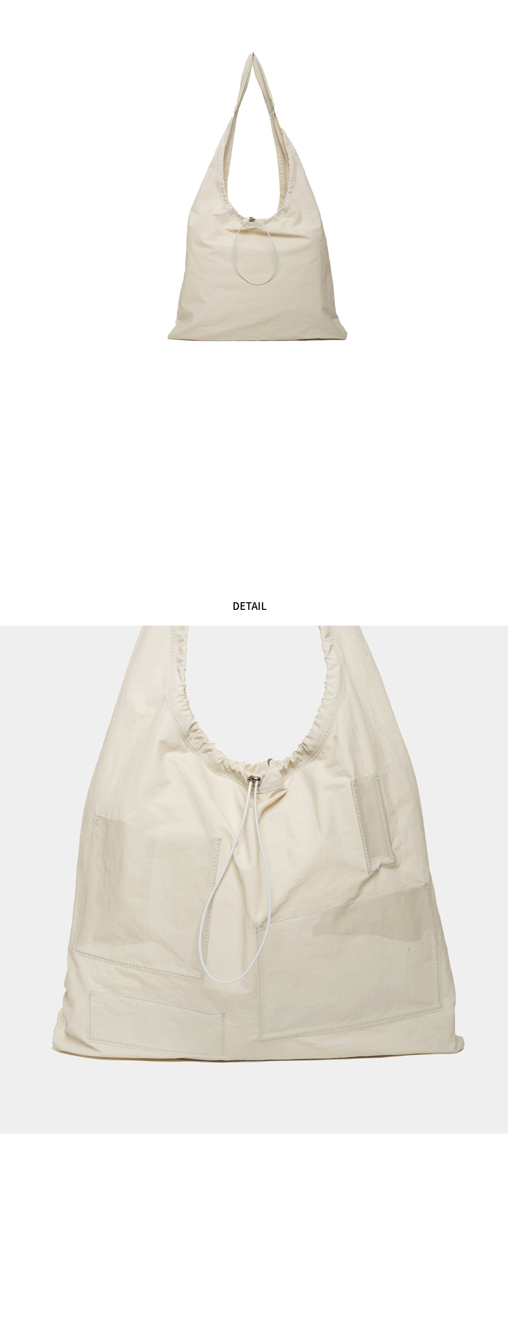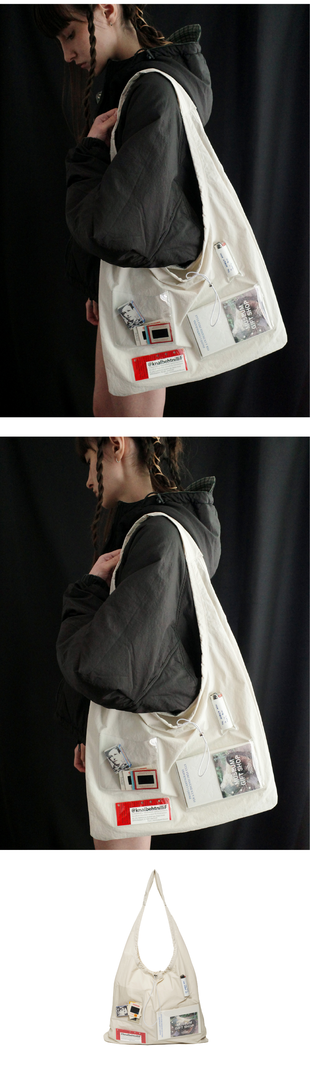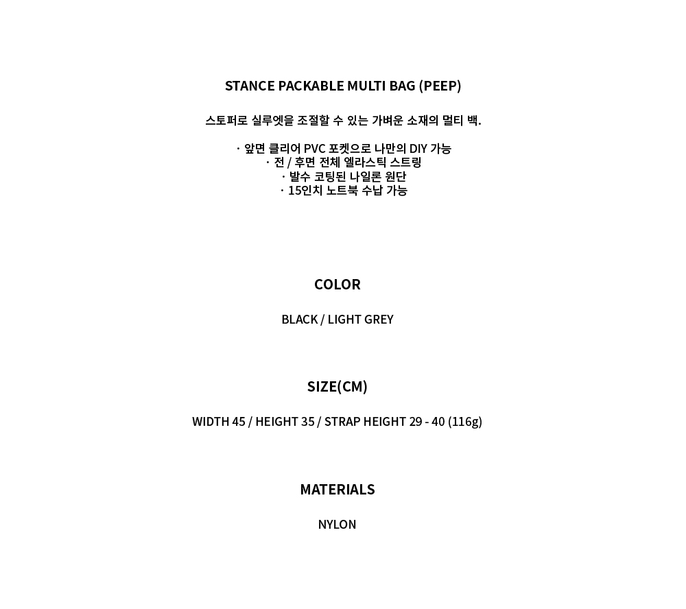 스토퍼로 실루엣을 조절할 수 있는 가벼운 소재의 멀티 백. · 앞면 클리어 PVC 포켓으로 나만의 DIY 가능 · 전 / 후면 전체 엘라스틱 스트링 · 발수 코팅된 나일론 원단 · 15인치 노트북 수납 가능