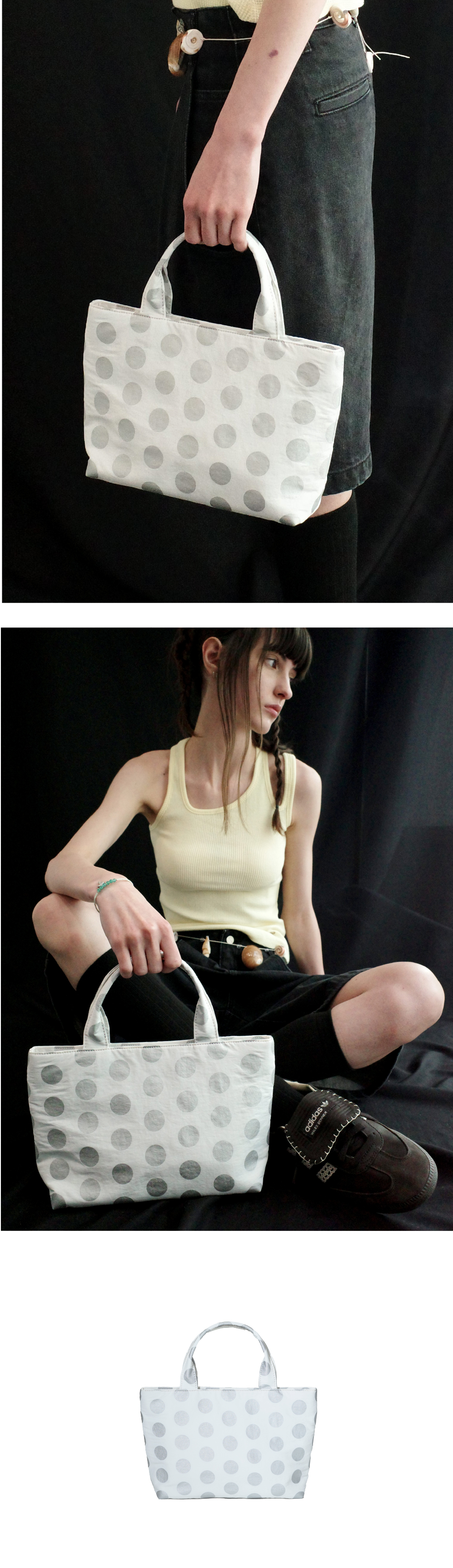 버튼와이드 토트백의 도트패턴 버전 · 부드러운 터치감의 나일론 원단 · 전면 도트패턴 프린트로 경쾌한 무드 연출 · 하단부 엘라스틱 씽 보강 작업으로 백 쉐입 유지 및 처짐 방지 · 실용적인 이너 포켓 구성