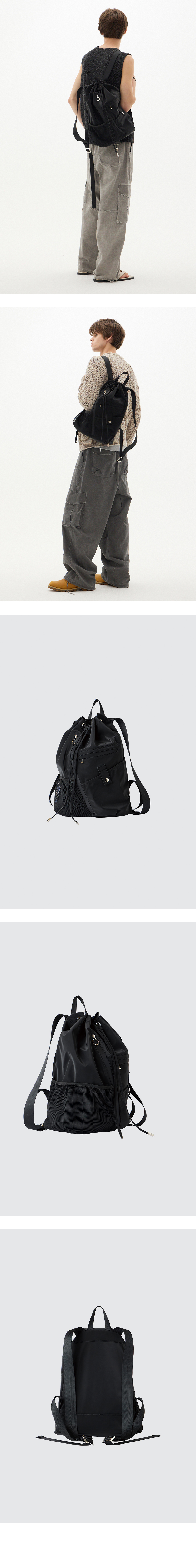 매끄러운 광택감이 감도는 나일론 원단으로 제작된 짐색. 실용성과 스타일을 동시에 갖춘 구조적 포켓 디테일. 컬러 : 블랙 원단 : 나일론 100% 나일론 텍스쳐 고급스러운 광택감 모던한 버클 넉넉한 수납 주머니 사이드 지퍼 봄, 여름, 가을, 겨울에 적합한 두께 MODEL SIZE2 : 185cm / 65kg OS SIZE - 측정 기준에 따라 1~2cm의 오차 범위가 발생할 수 있습니다. - 관리방법 : 드라이클리닝 유튜브 나일론 가방 소재 관리 검색 권장. 주문 시 르아제 "라임바질만다린" 박스 안에 분무하여 출고 됩니다. 향을 싫어 하실 경우 배송 메세지 함에 향X 라고 기재 부탁드립니다. 감사합니다.
