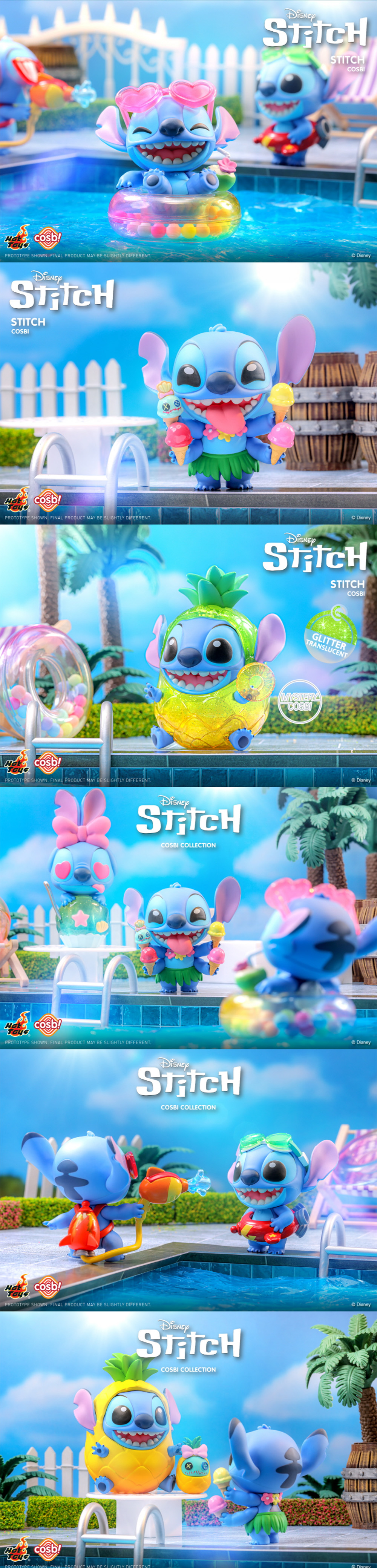 스티치 - 홀리데이 코스비 컬렉션 특징 ( 8개 1박스 세트단위 판매 ) - 양식화된 코스비 형태의 디즈니 캐릭터 - 약 6 - 11cm 높이 - 캐릭터 8종과 미스터리 버전 1종을 포함해 총 9가지 유형으로 수집 가능 - 전체 세트에 블라인드 박스 8개 포함(전체 세트 구매 시 반복되는 피규어 없음) - 특정 확률로 미스터리 버전을 획득할 수 있습니다 - 특별 수집 카드 포함 - 관절이 없는 피규어 - 연결 가능한 퍼즐 모양의 베이스 (비치볼을 들고있는 스티치 & 풀장 튜브에 있는 스티치 포함)