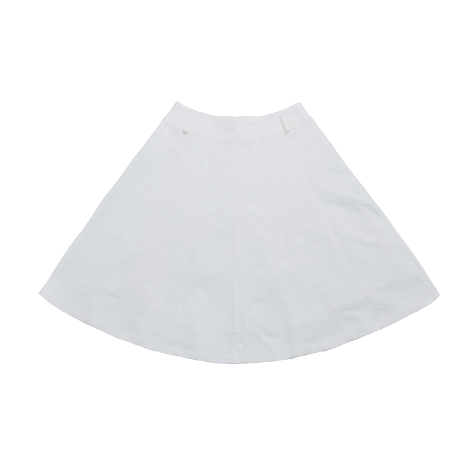 자카드 플레어 미디 스커트는 무릎까지 오는 미디 기장과 과하지 않은 플레어 주름이 매력적이며, 중앙의 절개선이 포인트가 되어 더욱 세련된 느낌을 줍니다. 허리단이 따로 없는 디자인으로 편안하게 착용 가능하며, 자연스럽게 흐르는 듯한 실루엣이 돋보입니다.