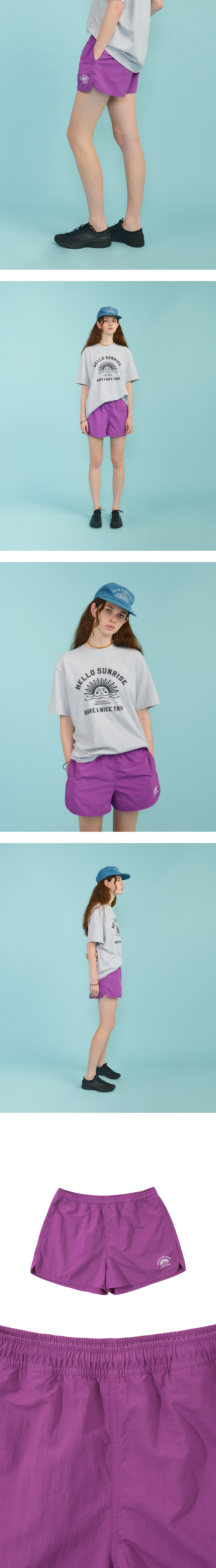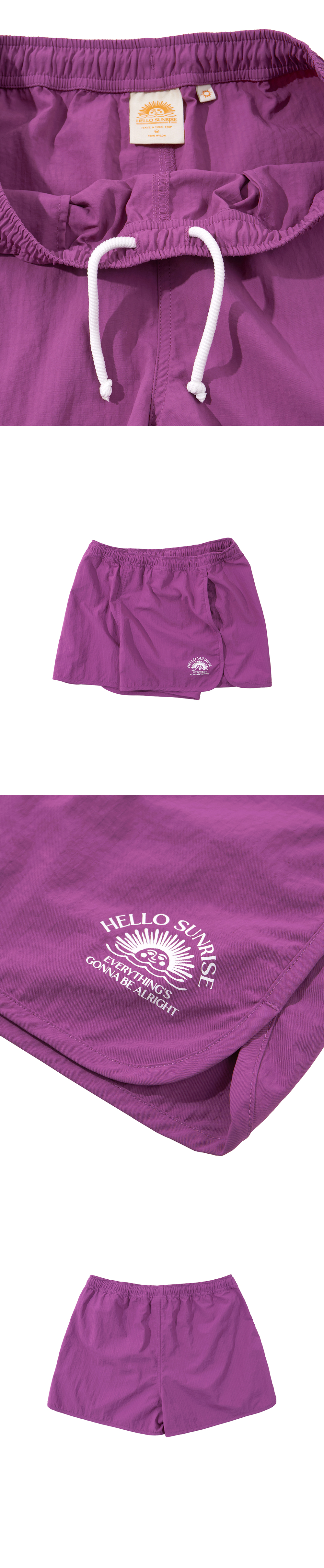 Hello Sunrise 레귤러핏의 짧은 기장감의 여성용 워터숏츠입니다. - 잔잔한 스트라이프 패턴이 들어간 소재 사용 - 전면 OG 아치로고 그래픽 나염처리 - 양쪽 사이드 포켓 - 허리 스트링으로 사이즈 조절 * Model : 177cm / Size : OS * 측정 기준에 따라 1-2cm의 차이가 있을 수 있습니다. * Nylon 100% Made in China