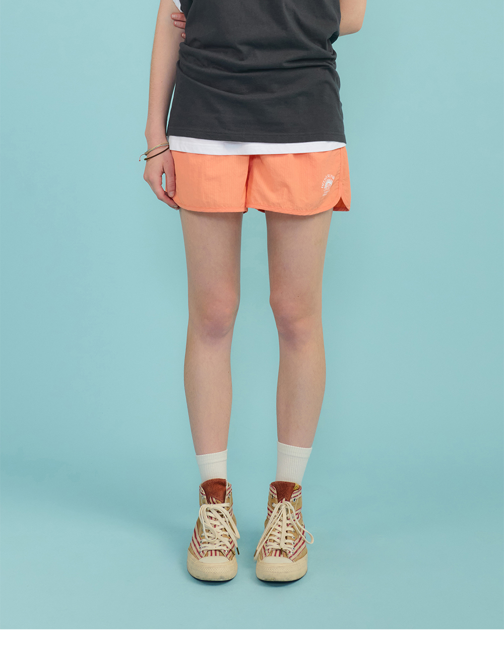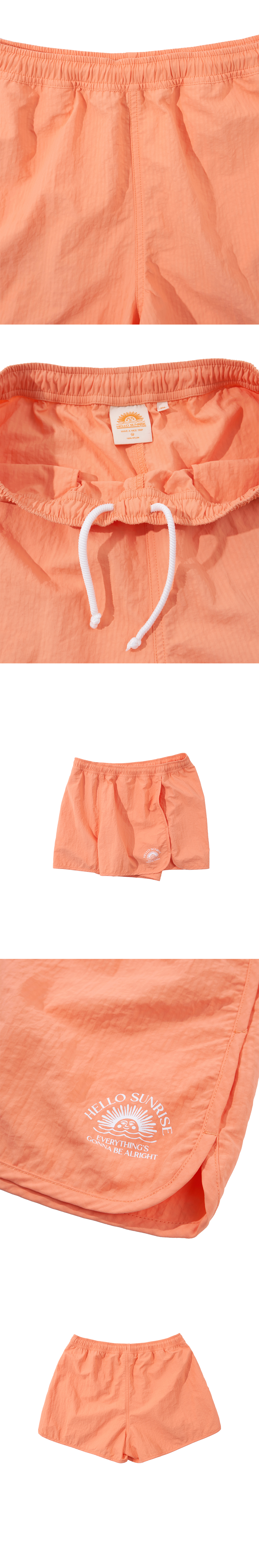 Hello Sunrise 레귤러핏의 짧은 기장감의 여성용 워터숏츠입니다. - 잔잔한 스트라이프 패턴이 들어간 소재 사용 - 전면 OG 아치로고 그래픽 나염처리 - 양쪽 사이드 포켓 - 허리 스트링으로 사이즈 조절 * Model : 177cm / Size : OS * 측정 기준에 따라 1-2cm의 차이가 있을 수 있습니다. * Nylon 100% Made in China