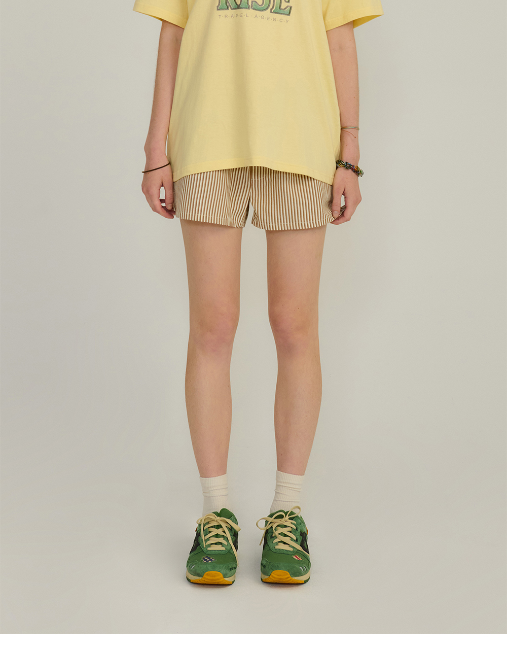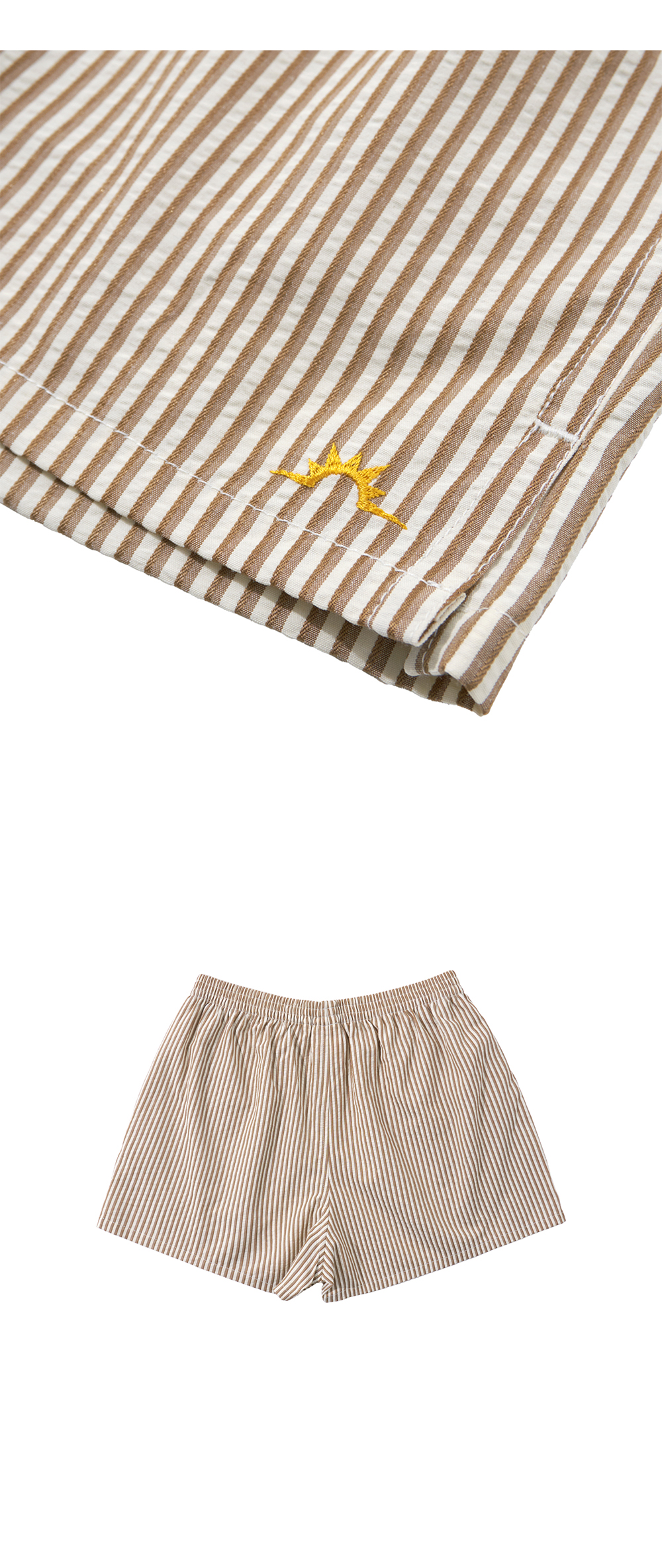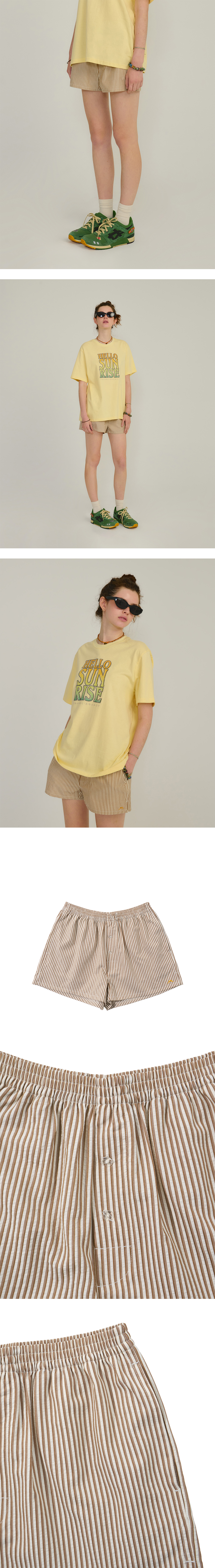 Hello Sunrise 짧은 기장감의 여성용 복서 쇼츠입니다. - 스트라이프 패턴이 들어간 코튼 소재 사용 - 전면 심볼로고 그래픽 자수처리 - 양쪽 사이드 포켓 - 허리 밴드 사용으로 편안한 착용 * Model : 177cm / Size : OS * 측정 기준에 따라 1-2cm의 차이가 있을 수 있습니다. * Cotton 100% Made in China
