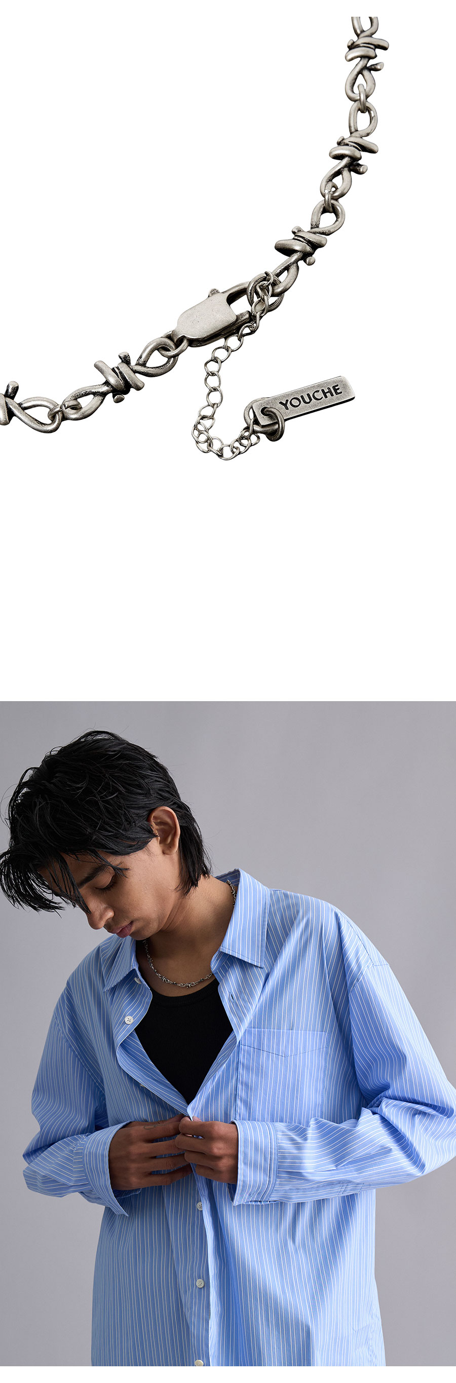 Material Outshell 1 : Surgical steal 100% Outshell 2 : Surgical steal 100% Colour : Burnished silver - Surgical steal chain - Silver burnished processing - Youche logo pendant - Adjustable chain 취급시 주의사항 *땀이나 물, 습기에 노출시 변색이 될 우려가 있습니다. *부드러운 천으로 관리해주시면 새제품처럼 오래 사용하실 수 있습니다. *장기간 보관시 밀폐된 용기에 보관하시는 것을 추천드립니다.