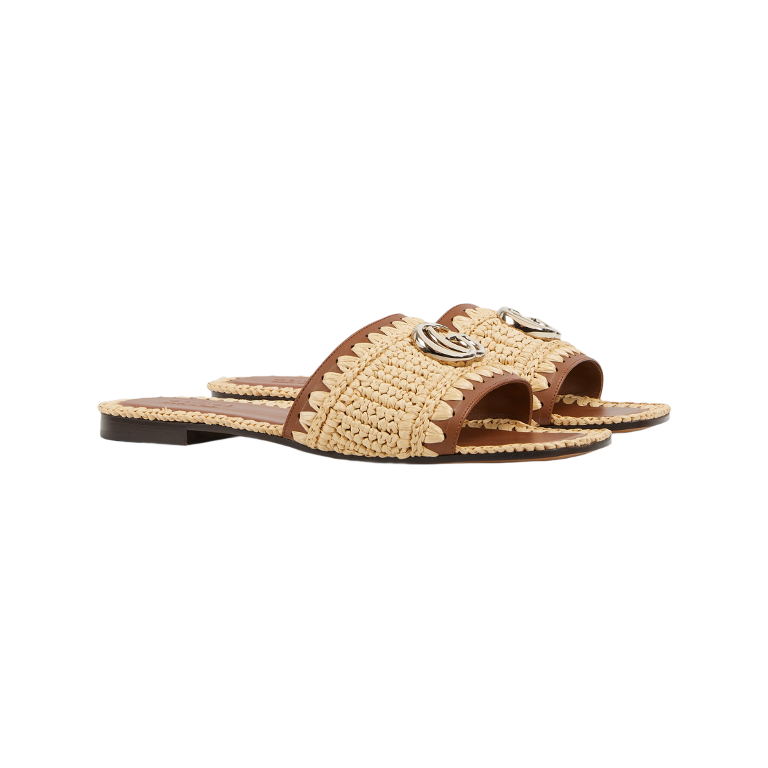 (W) 구찌 슬라이드 샌들 더블 G 내츄럴 라피아 크로쉐