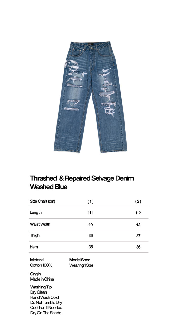 선데이오프클럽 쓰래쉬드 & 리페어드 셀비지 데님 워시드 블루