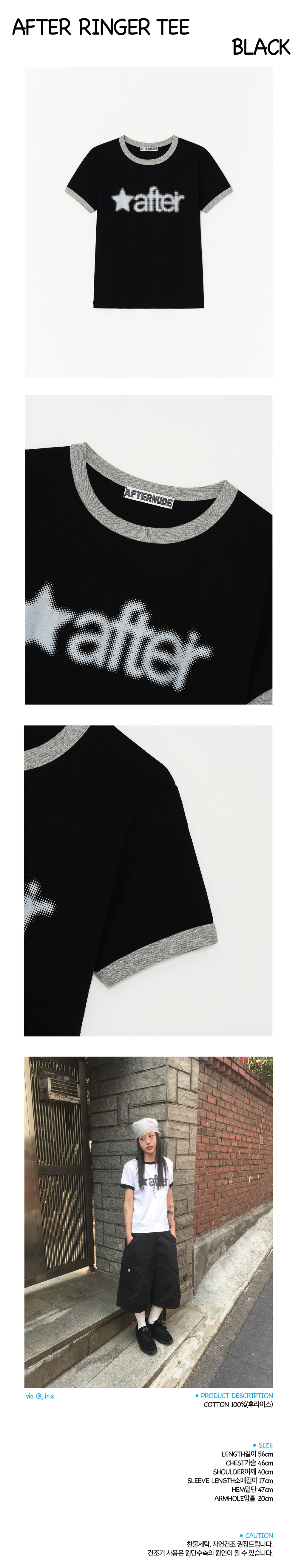 - 가장자리 도트 디자인이 들어간 ‘AFTER’ 로고를 넣은 링거 티셔츠 - 스판성 있는 후라이스 원단을 사용하여, 착용감이 우수합니다. - 전면부 실크스크린 도트 프린팅 나염