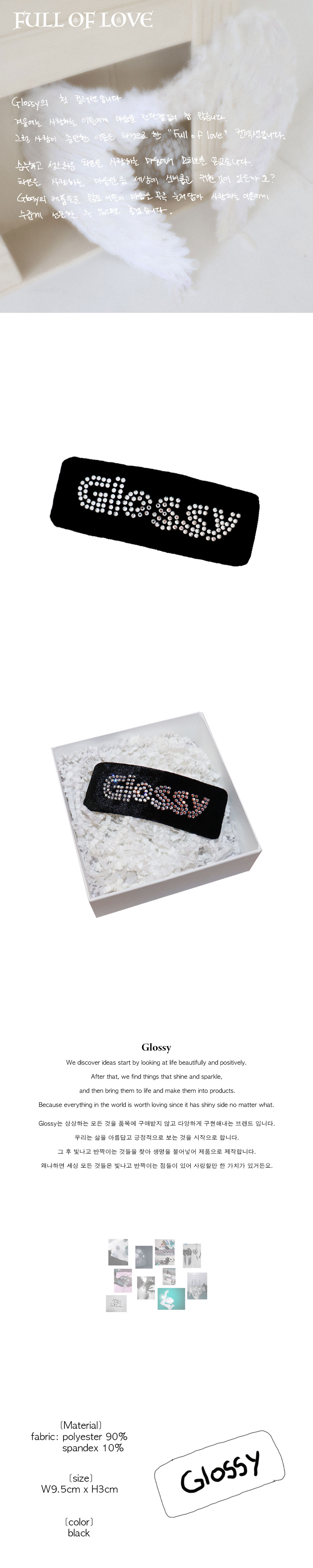 로맨틱한 무드의 벨벳 헤어핀 입니다. 큐빅으로 만든 Glossy 로고가 빛을 받을 때마다 반짝입니다. 사이즈: 가로 9.5cm*세로 3cm 겉감: 폴리 90% 스판 10% * 큐빅을 강한 힘으로 만졌을 때 떨어질 수 있으니 주의해주세요.