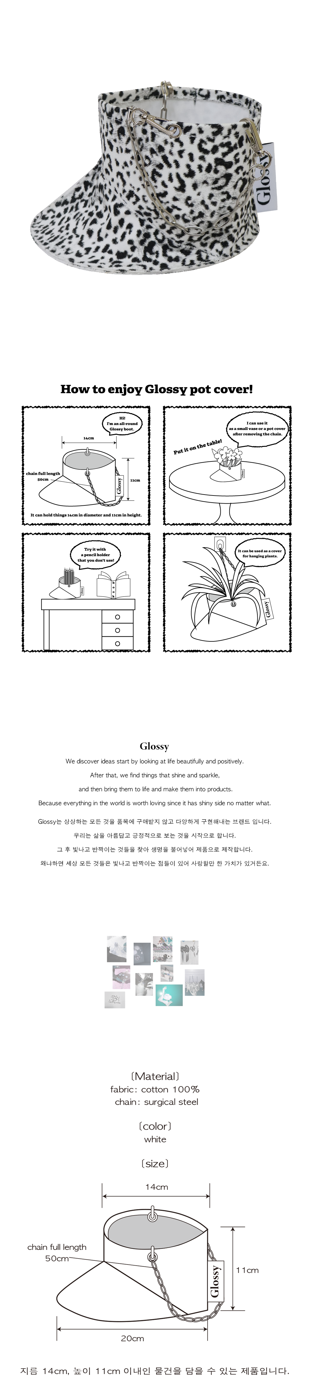 부츠 모양의 팟 커버 입니다. 팟 커버 뿐만 아니라 지름 14cm, 높이 11cm 이내의 화병 및 연필 꽂이 커버 등 다양하게 사용 가능합니다. 체인은 탈부착이 가능하여, 체인을 걸어 행잉 플랜트 커버로도 사용 가능합니다. 사이즈: 너비 20cm*높이*11cm/내부 지름: 14cm 겉감: 면 100% 세탁방법 * 중성세제를 사용하여 단독 손세탁 해주세요.(세탁기 사용 금지) * 건조시 입구가 바닥으로 향하여 평평한 곳에서 거꾸로 건조해주세요.(건조기 사용 금지) * 다리미 이용시 100도 이하해서 해주세요.