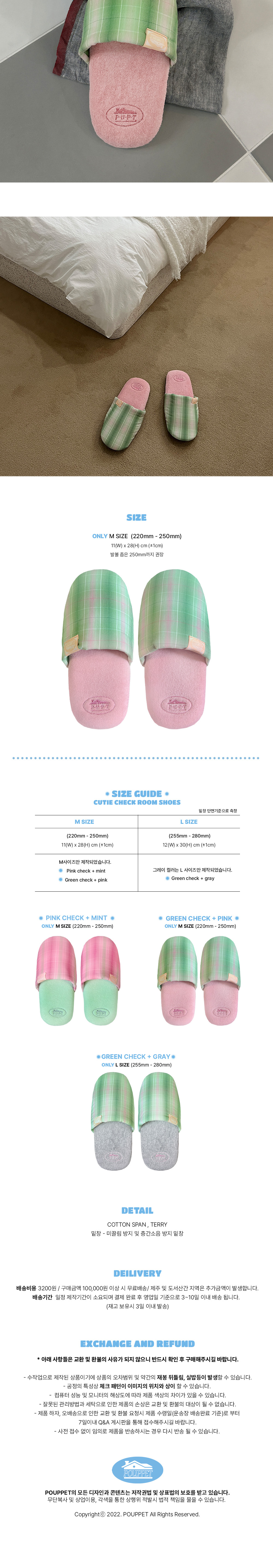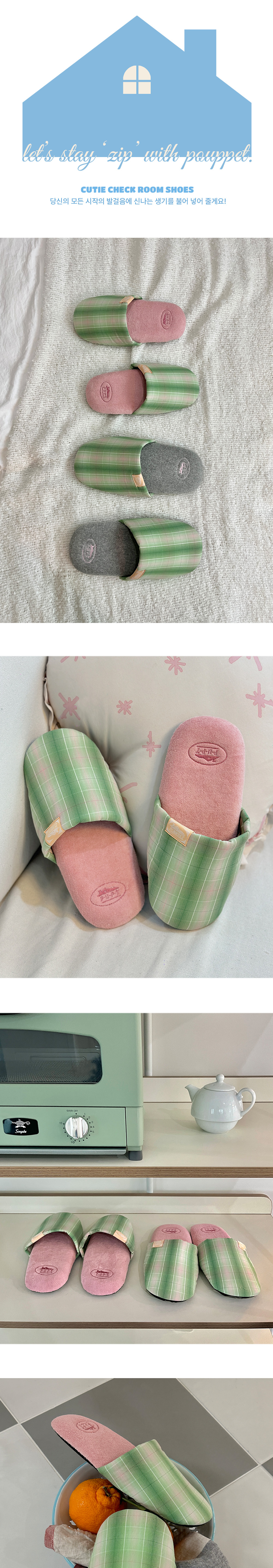 [3% 적립] POUPPET Cutie Check Room Shoes Green check + pink M size