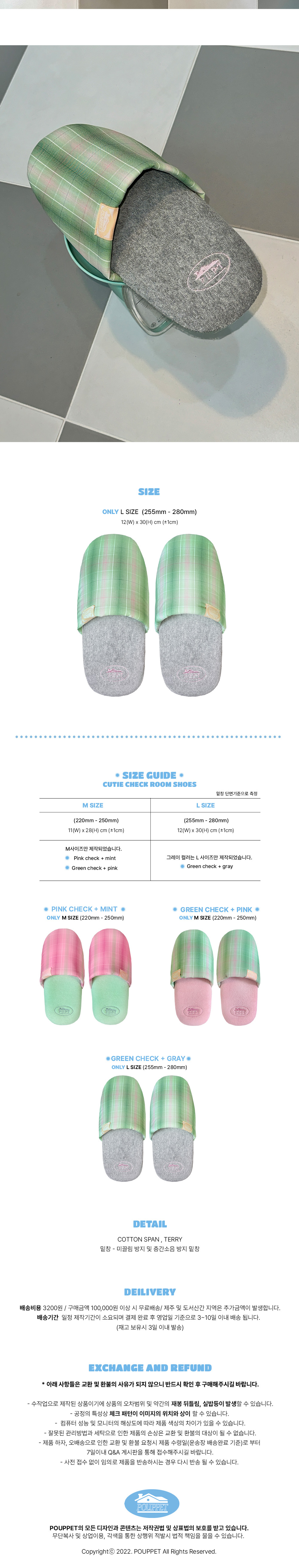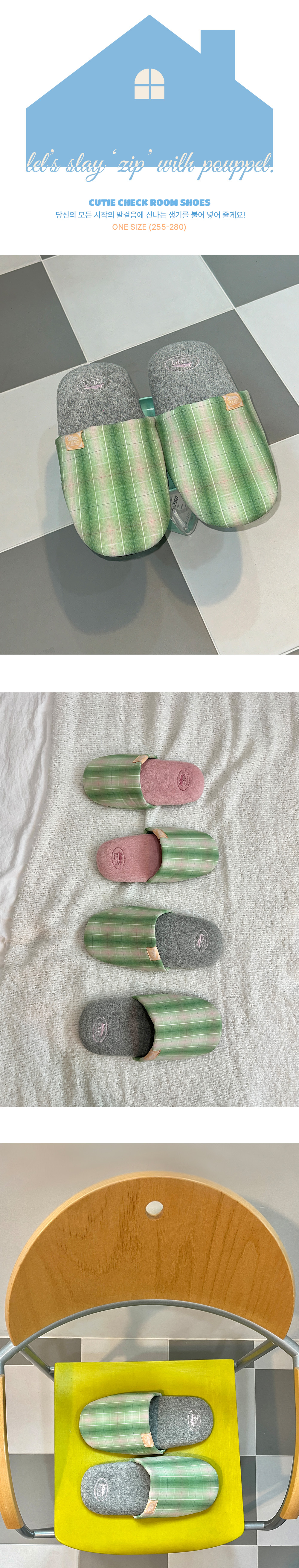[3% 적립] POUPPET Cutie Check Room Shoes Green check + gray L size