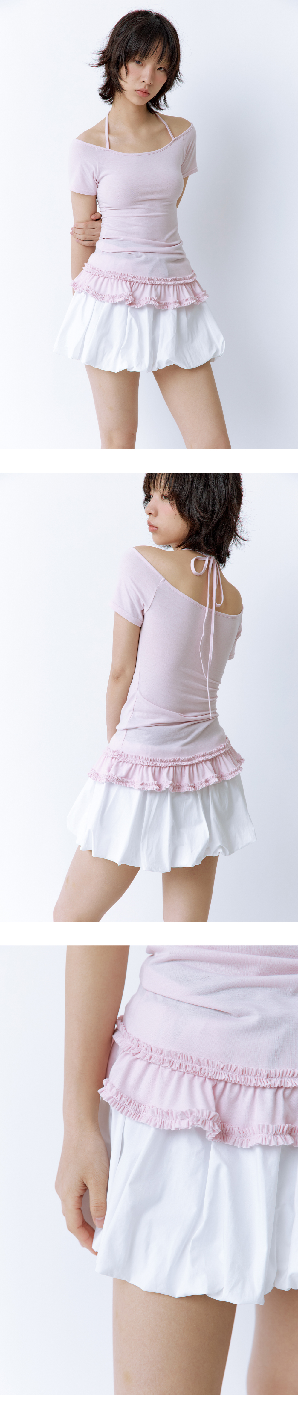 목에 끈을 묶어 착용하는 스타일의 티셔츠로, 어깨와 목선을 예쁘게 잡아주는 오프숄더 디자인입니다. 밑단에는 이중 러플 디테일이 더해져 베이직한 실루엣에 포인트를 줍니다. Model size : SUJI 170cm 50kg / SUMMER 167cm 49kg Fitting size : S Material : Polyester 61% Cotton 33% Span 6%