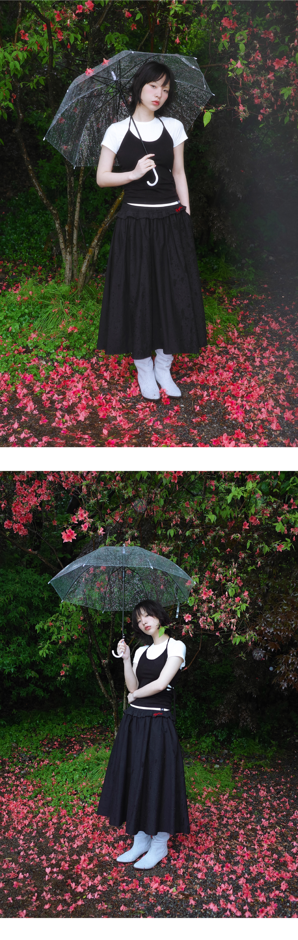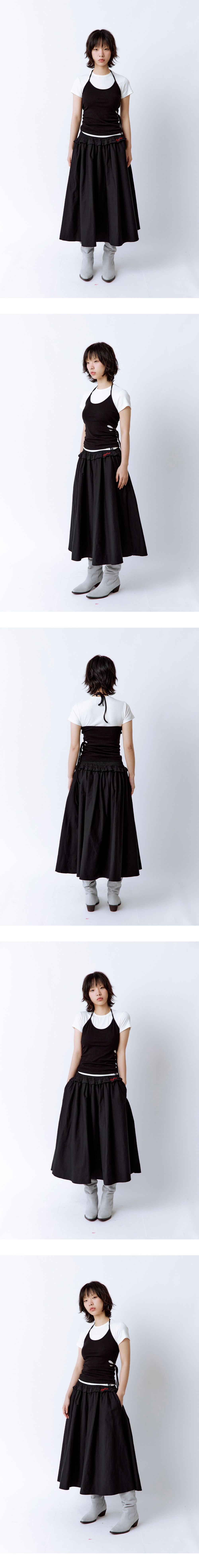 허리 전체 밴딩으로 착용이 간편하고 편안한 착용감을 제공합니다. 넉넉한 원단 사용으로 풍성한 볼륨감을 살렸으며, 허리 윗단부터 자연스럽게 흘러내리는 주름이 특징입니다. 밴드 아래 귀여운 러플 디테일이 더해졌고, 양옆에는 깊은 포켓이 있어 실용성을 높였습니다. 도톰한 원단으로 비침 없이 안정감 있게 착용할 수 있습니다. Model size : SUJI 170cm 50kg / SUMMER 167cm 49kg Fitting size : Free Material : Cotton 97% Span 3%