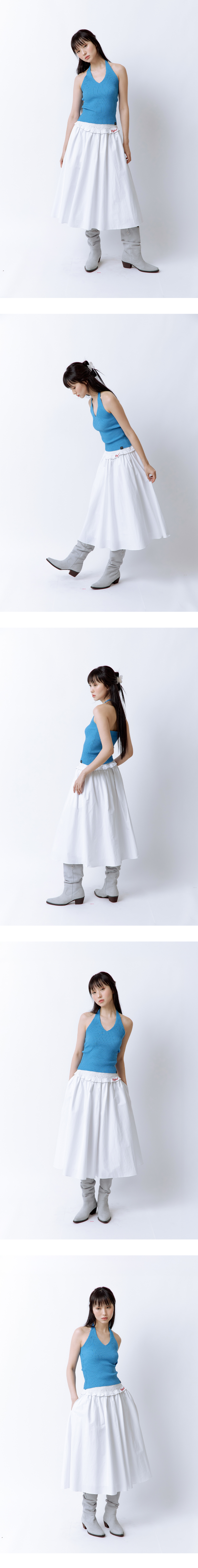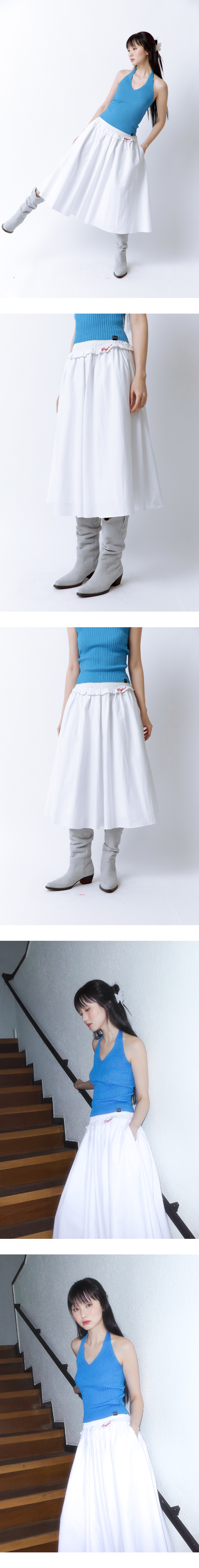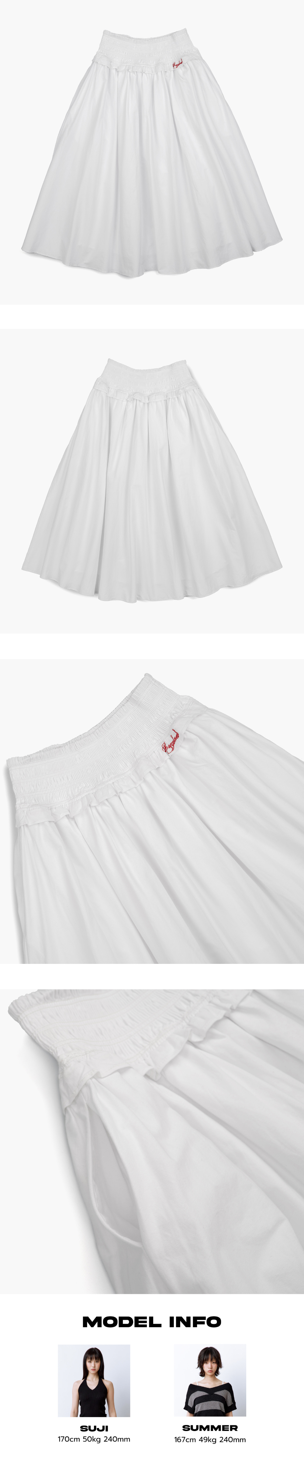 허리 전체 밴딩으로 착용이 간편하고 편안한 착용감을 제공합니다. 넉넉한 원단 사용으로 풍성한 볼륨감을 살렸으며, 허리 윗단부터 자연스럽게 흘러내리는 주름이 특징입니다. 밴드 아래 귀여운 러플 디테일이 더해졌고, 양옆에는 깊은 포켓이 있어 실용성을 높였습니다. 도톰한 원단으로 비침 없이 안정감 있게 착용할 수 있습니다. Model size : SUJI 170cm 50kg / SUMMER 167cm 49kg Fitting size : Free Material : Cotton 97% Span 3%