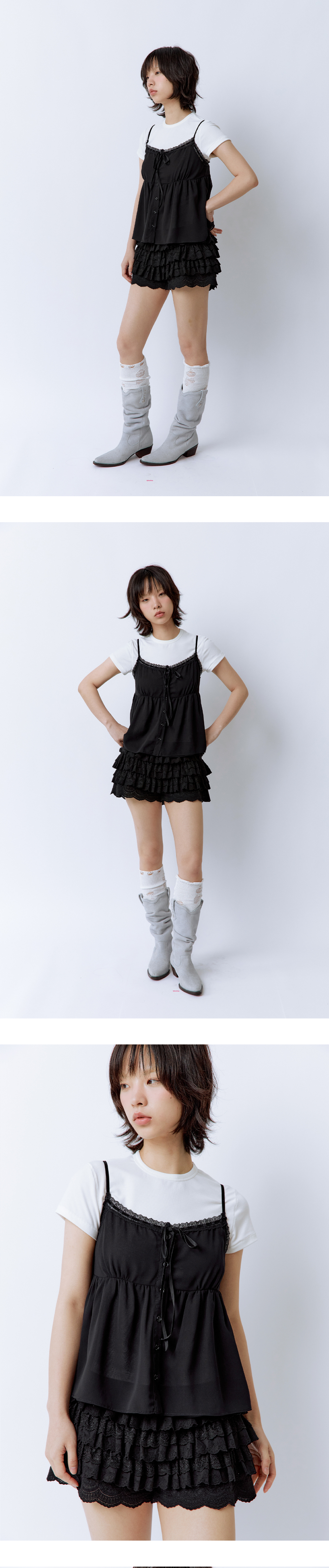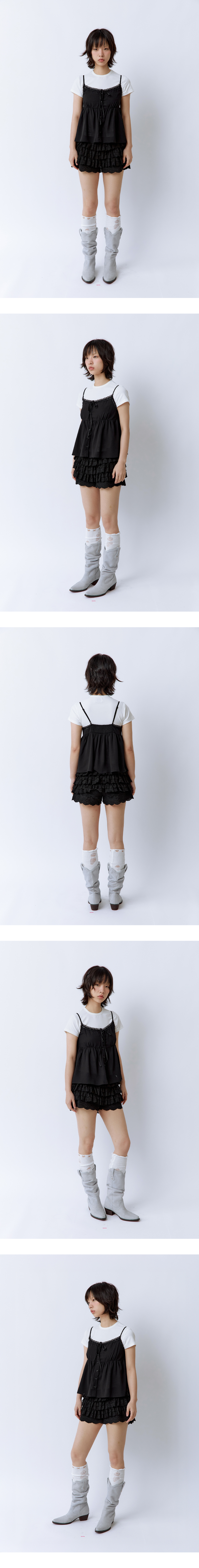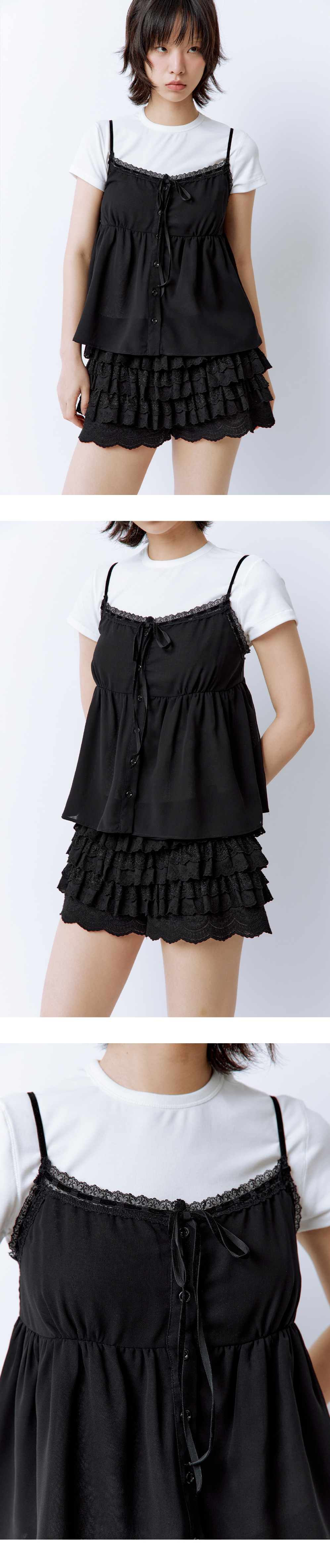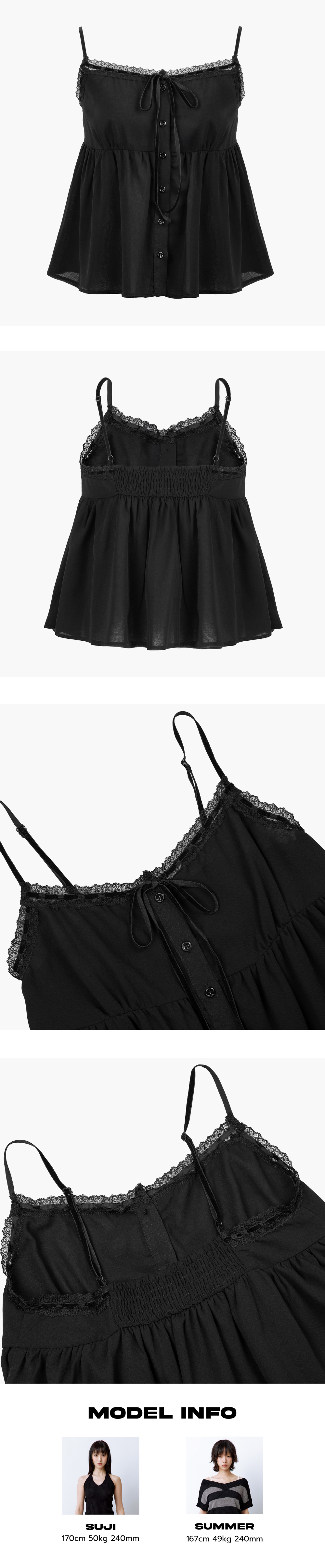 사르르 떨어지는 쉬폰 소재로 하늘하늘한 실루엣이 돋보이는 슬리브리스 탑입니다. 허리 라인은 은은한 굴곡 패턴으로 디자인되어 부해 보이지 않고, 귀엽운 실루엣을 연출해줍니다. 가슴 부분은 이중 원단 처리로 비침 걱정 없이 편안하게 착용할 수 있으며, 벨벳 리본과 섬세한 레이스 디테일이 포인트가 되어줍니다. 뒷면의 스모크 밴딩은 착용감을 높여주고, 길이 조절이 가능한 어깨 끈으로 체형에 맞게 핏 조절이 가능합니다. Model size : SUJI 170cm 50kg / SUMMER 167cm 49kg Fitting size : S Material : Polyester 100%