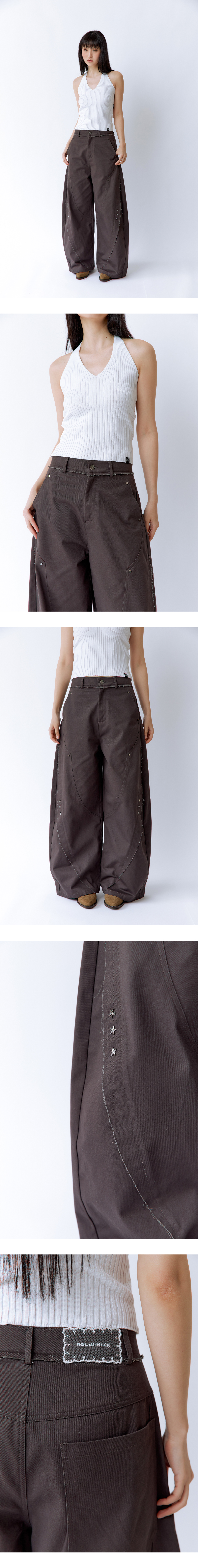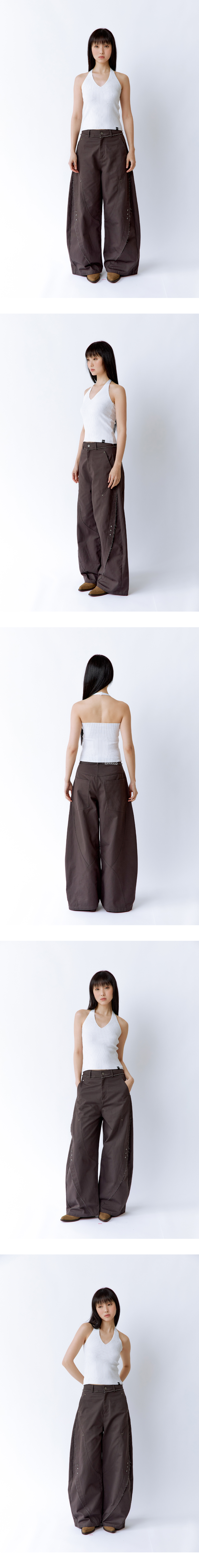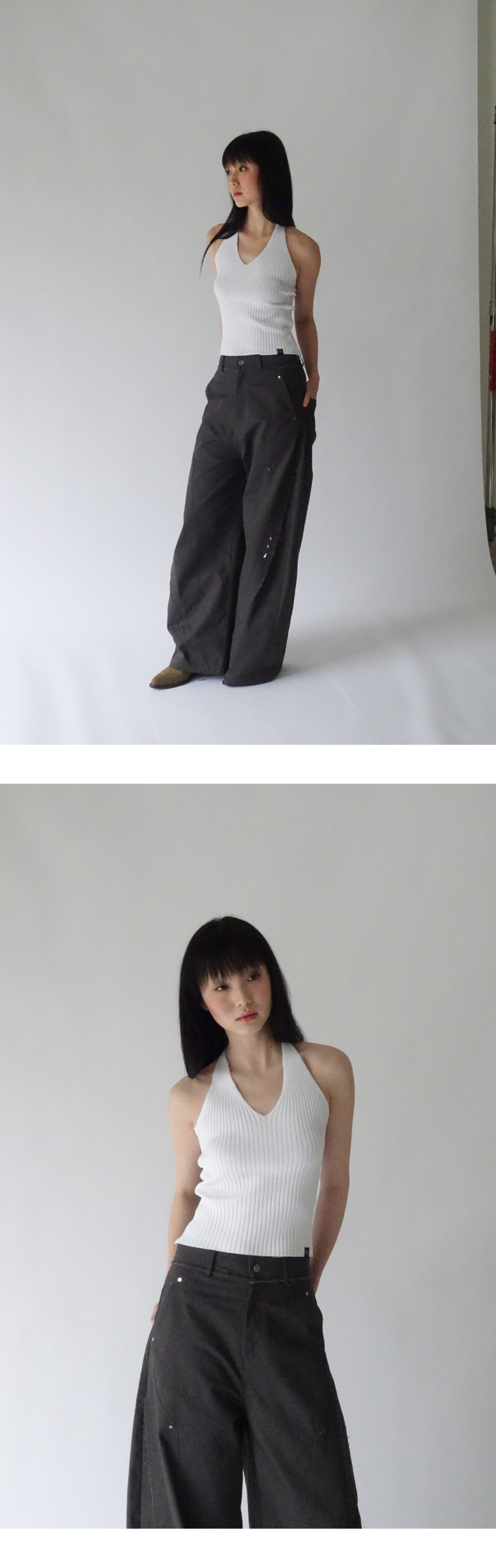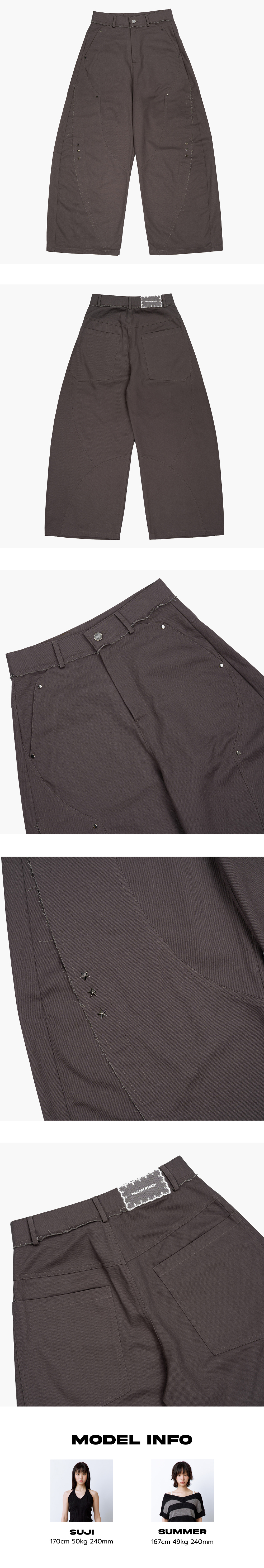카펜터 스타일의 과감한 절개 디테일과 실버 리벳 장식이 돋보이는 와이드 팬츠입니다. 다리 라인을 따라 흐르는 절개선마다 러프하게 처리된 마감이 더해져 빈티지한 무드를 연출해주며, 전체적으로 여유 있는 핏으로 편안한 착용감을 자랑합니다. Model size : SUJI 170cm 50kg / SUMMER 167cm 49kg Fitting size : S Material : Cotton 100%