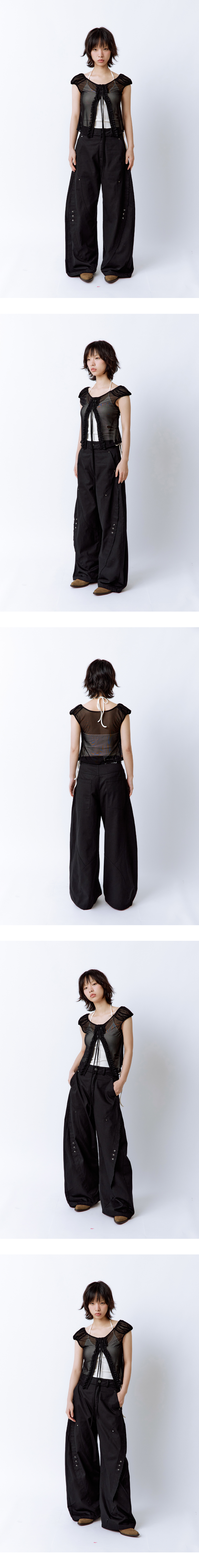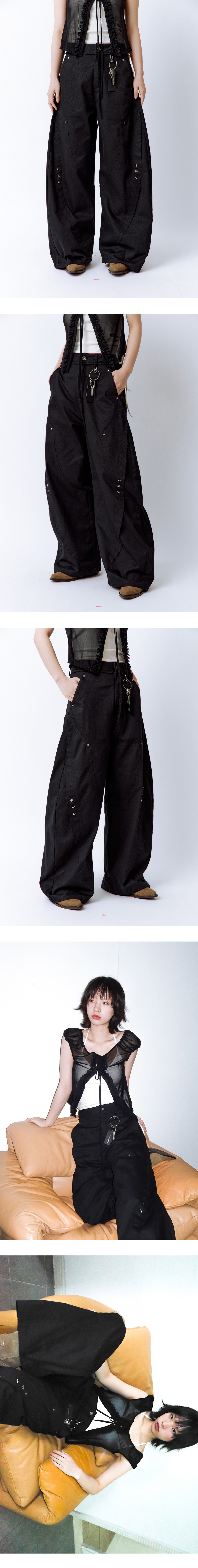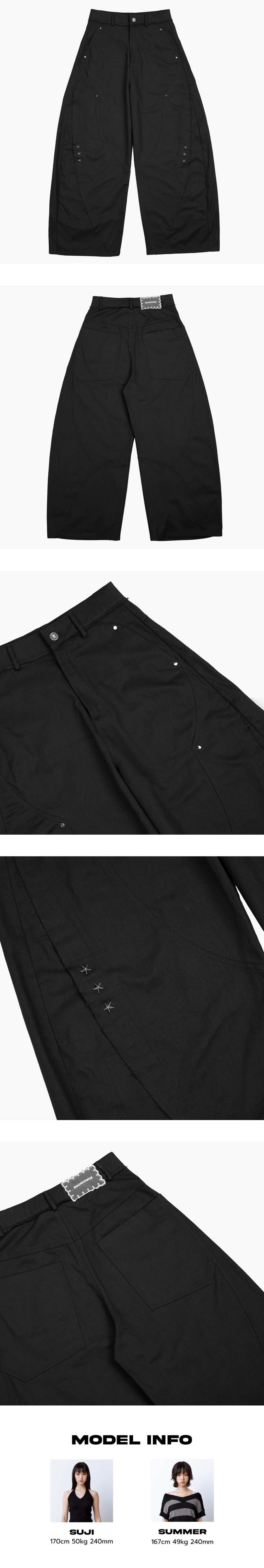 카펜터 스타일의 과감한 절개 디테일과 실버 리벳 장식이 돋보이는 와이드 팬츠입니다. 다리 라인을 따라 흐르는 절개선마다 러프하게 처리된 마감이 더해져 빈티지한 무드를 연출해주며, 전체적으로 여유 있는 핏으로 편안한 착용감을 자랑합니다. Model size : SUJI 170cm 50kg / SUMMER 167cm 49kg Fitting size : S Material : Cotton 100%