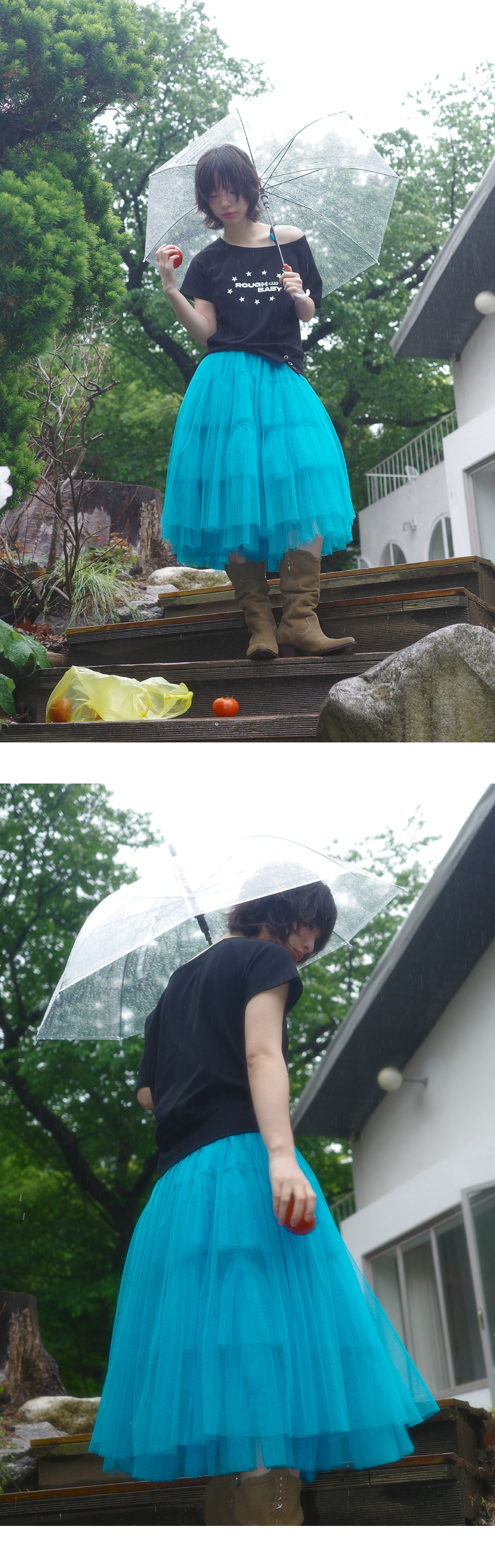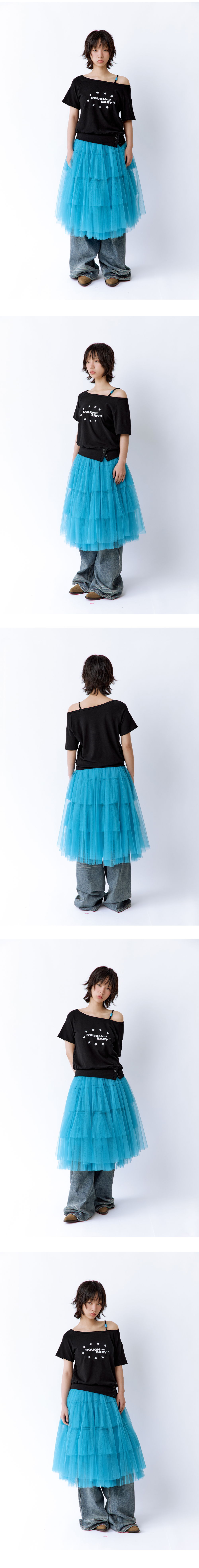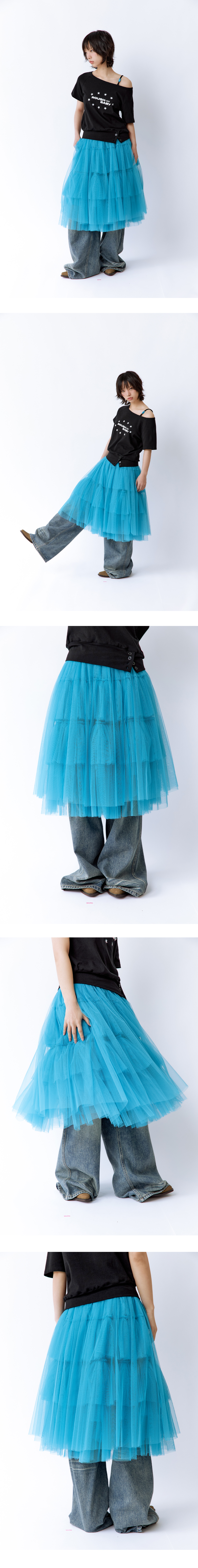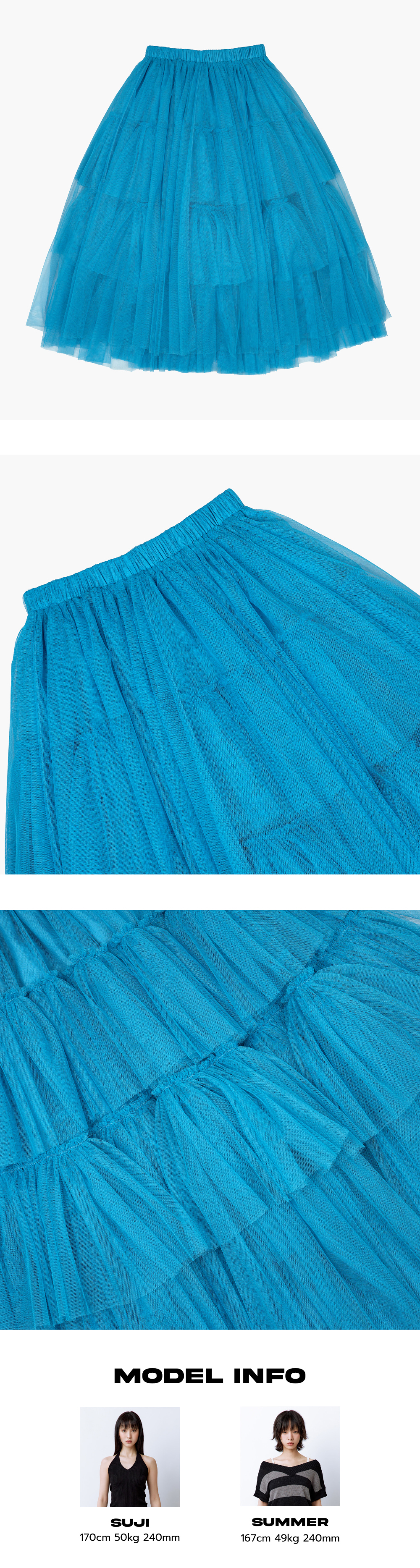 가볍고 탄탄한 튤 원단을 여러 겹으로 층층이 쌓아 풍성한 실루엣을 완성한 스커트입니다. 넉넉하게 원단을 사용해 움직일 때마다 살아나는 볼륨감이 매력적이며, 허리는 밴딩 처리되어 편하게 착용할 수 있습니다. 밑단은 은은하게 비치는 시스루 디테일로 스타일에 가벼운 포인트를 더해주고, 속치마를 덧대어 속옷 비침 걱정 없이 안정감 있게 입을 수 있습니다. Model size : SUJI 170cm 50kg / SUMMER 167cm 49kg Fitting size : Free Material : Polyester 100%