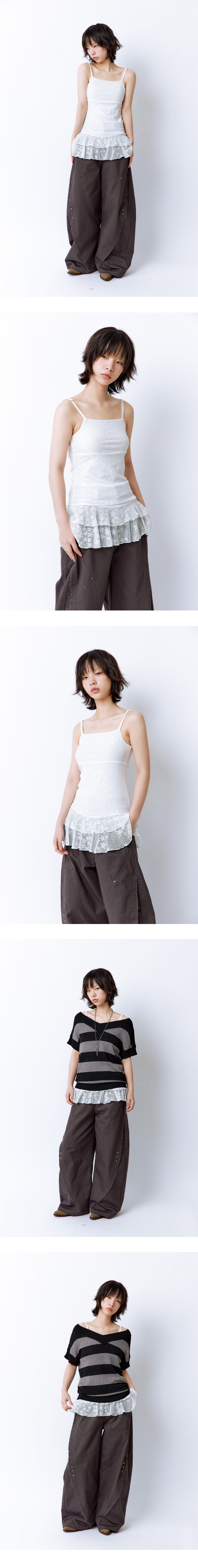 은은한 별 패턴의 매쉬 원단과 밑단의 이중 러플 디테일이 사랑스러운 포인트가 되어주는 레이어드 탑입니다. 가볍고 시원한 착용감으로 끈은 길이 조절이 가능해 체형에 맞게 착용할 수 있으며, 단독은 물론 다양한 상의에 레이어드해 귀엽게 연출할 수 있습니다. 안감이 더해져 비침 걱정 없이 착용 가능합니다. Model size : SUJI 170cm 50kg / SUMMER 167cm 49kg Fitting size : S Material : Cotton 90% Span 10%