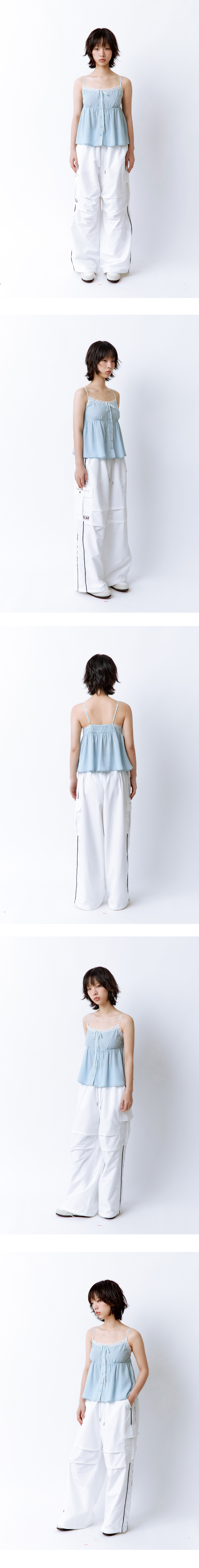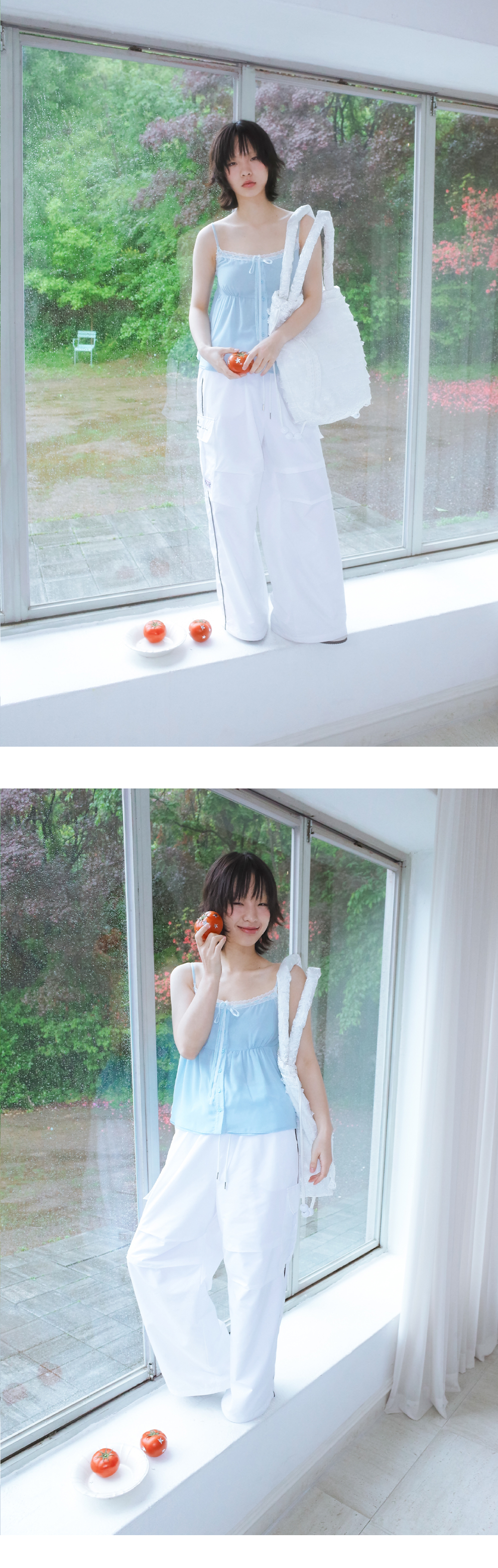 이 팬츠는 와이드한 핏으로 여유롭고 편안한 착용감을 제공합니다. 탄탄한 나일론 원단을 사용해 내구성이 뛰어나며, 부드러운 안감이 덧대어져 속옷 비침 걱정 없이 안정감 있게 착용할 수 있습니다. 밑단에는 스트링이 있어 길이 조절이 가능하고, 조거 팬츠 스타일로도 자유롭게 연출할 수 있습니다. 파이핑으로 컬러 배색 디테일을 더했고, 포켓 부분의 리벳 장식이 러프넥만의 무드를 완성해줍니다. Model size : SUJI 170cm 50kg / SUMMER 167cm 49kg Fitting size : Free Material : Polyester 100%