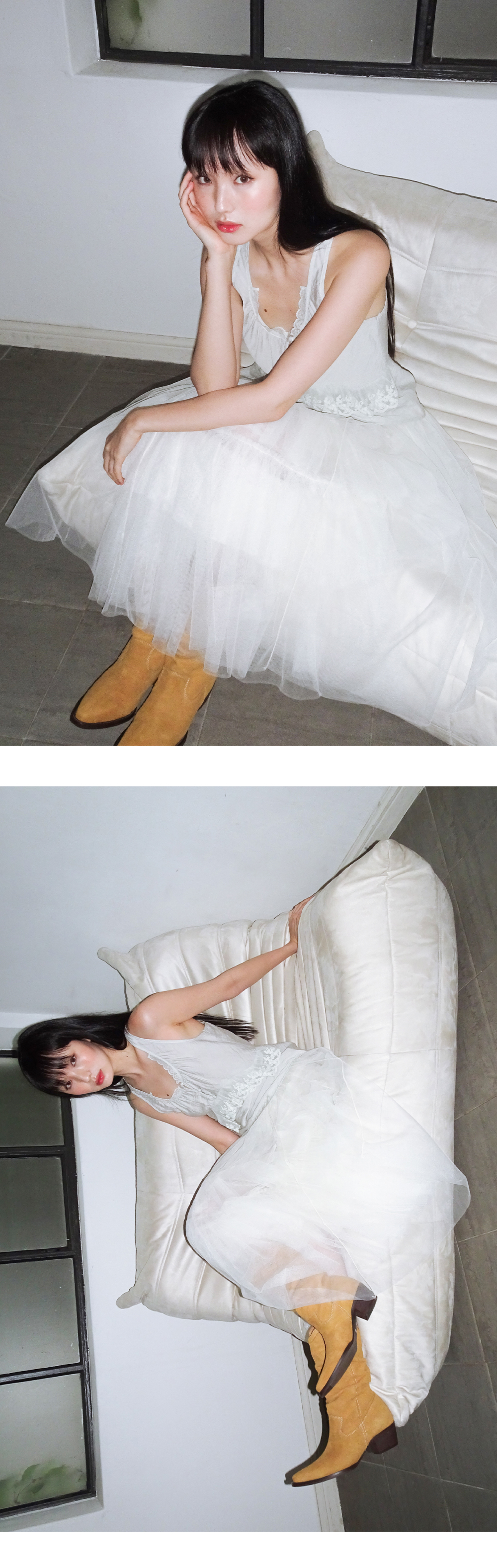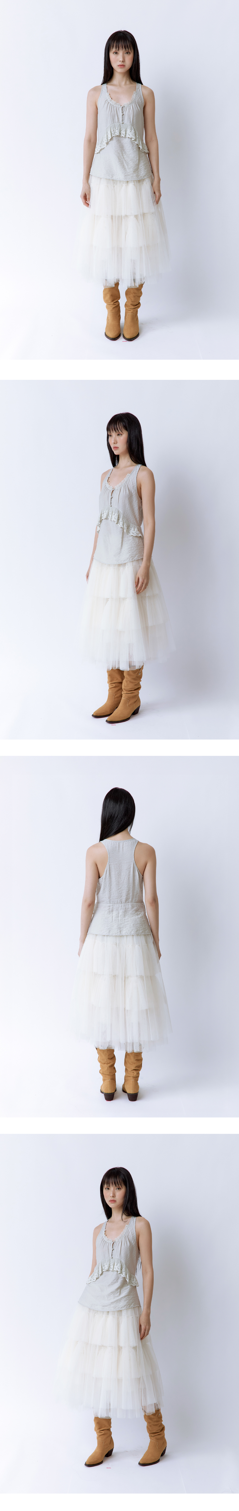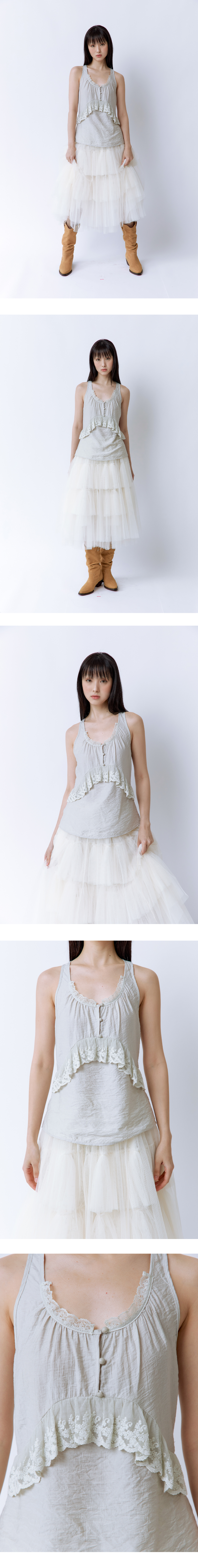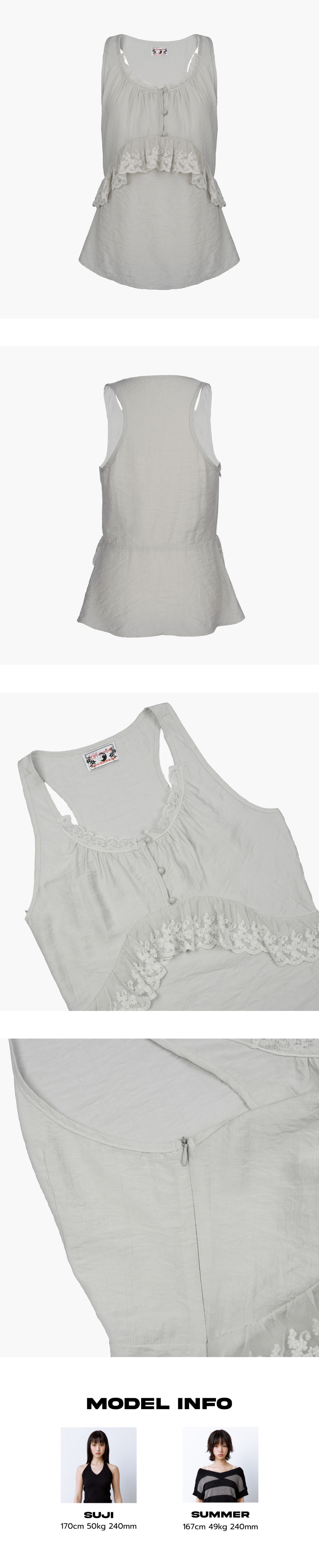 여름과 빈티지한 무드를 담아낸 슬리브리스 탑입니다. 가슴 부분의 셔링과 레이스 디테일이 포인트가 되며, 허리 라인이 살짝 들어가고 밑단은 퍼지는 실루엣으로 입었을 때 깔끔한 핏이 연출됩니다. 옆에 지퍼가 있어 착용이 간편하고, 가볍고 시원한 원단으로 여름철에도 부담 없이 입을 수 있습니다. Model size : SUJI 170cm 50kg / SUMMER 167cm 49kg Fitting size : S Material : Nylon 80% Rayon 20%