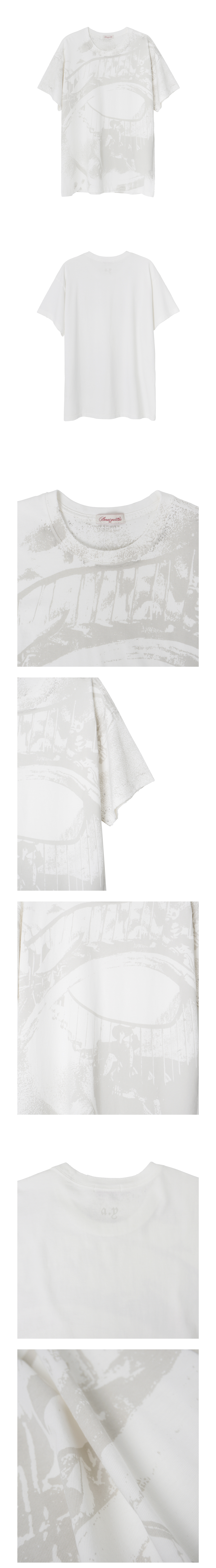 No. AY-CT18 릴랙스 핏 실루엣의 올오버 프린트 반팔 티셔츠입니다. ‘Numb’이라는 키워드를 기반으로 제작된 시즌 그래픽 제품으로, 전면 프린트는 목 시보리부터 소매, 몸판까지 자연스럽게 연결되도록 구성하였습니다. 고밀도 20수 코마사 싱글 저지 원단을 사용해 부드러운 터치감과 자연스러운 착용감을 제공하며, 페이드 블랙 컬러는 설파 염료를 사용해 가먼트 다잉하여, 착용할수록 자연스러운 에이징과 경년 변화를 느낄 수 있습니다. 밑단과 소매단은 싱글 스티치로 마감하고, 수작업 데미지 가공을 더해 유즈드한 분위기를 연출했습니다. 그래픽과 원단 컬러의 톤 차이를 은은하게 조정해, 시각적으로 과하지 않으면서도 포인트가 될 수 있는 제품이라고 생각합니다. MADE IN KOREA Color Off White Material Cotton 100%