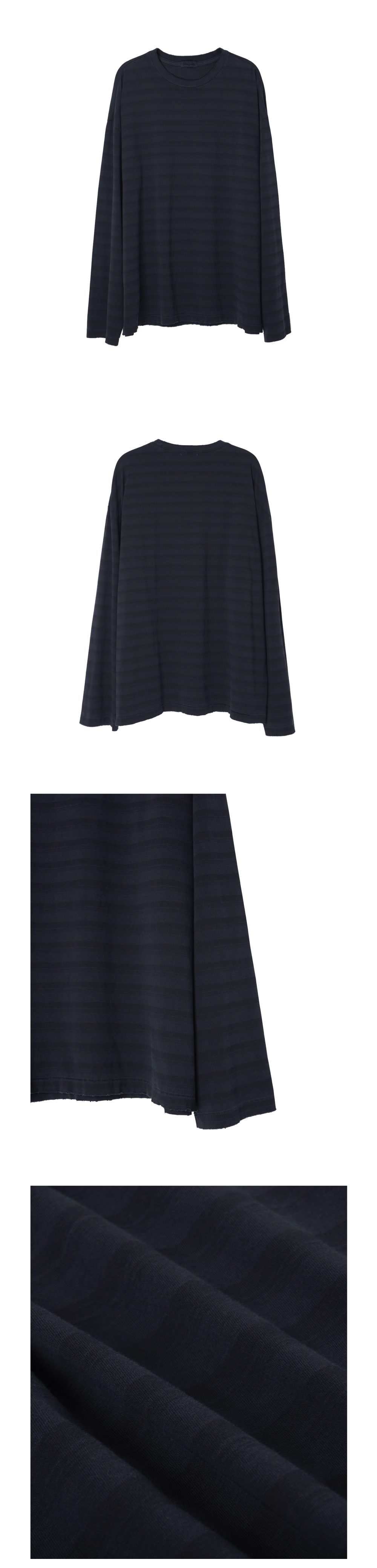 No. AY-CT13 세미 오버핏 실루엣의 보더 티셔츠입니다. 고밀도 20수 코마사 싱글 저지 원단을 사용해 부드러운 터치감과 자연스러운 자연스러운 착용감을 제공합니다. 핸드 브러쉬로 그린 스트라이프를 프린팅 후, 가먼트 다잉 공정을 더해 자연스럽고 깊이감 있는 컬러감을 구현했습니다. 은은하게 드러나는 스트라이프가 특징이며, 밑단과 소매단은 싱글 스티치로 마감하고, 수작업 데미지 가공을 더해 유즈드한 분위기를 연출했습니다. 어깨선은 여유 있게 떨어지며, 소매는 살짝 긴 기장으로 자연스럽고 편안한 실루엣을 만들어줍니다. 이번 시즌에는 더욱 깊이감 있는 컬러로 재구성했으며, 기존 AY-CT19 제품 대비 총장과 소매장을 다소 조정해 단독 착용 시의 밸런스를 보다 세심하게 다듬었습니다. MADE IN KOREA Color Midnight Black Material Cotton 100%