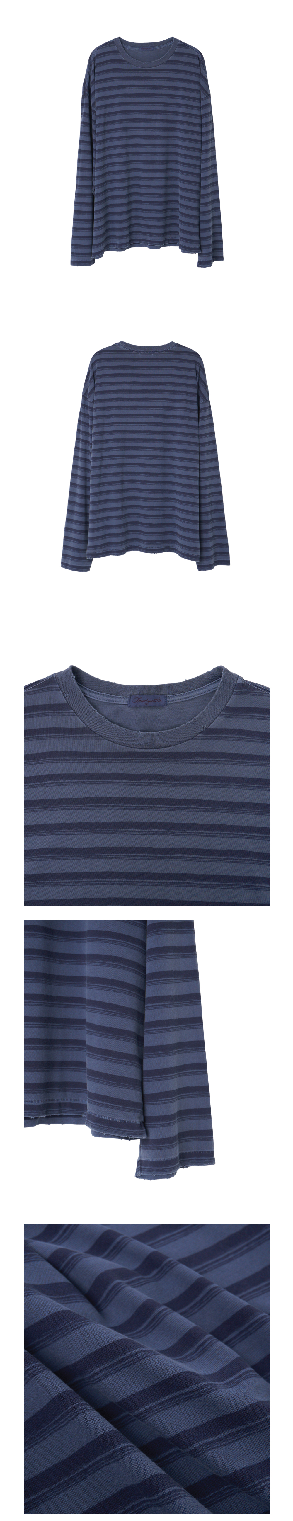 No. AY-CT13 세미 오버핏 실루엣의 보더 티셔츠입니다. 고밀도 20수 코마사 싱글 저지 원단을 사용해 부드러운 터치감과 자연스러운 자연스러운 착용감을 제공합니다. 핸드 브러쉬로 그린 스트라이프를 프린팅 후, 가먼트 다잉 공정을 더해 자연스럽고 깊이감 있는 컬러감을 구현했습니다. 은은하게 드러나는 스트라이프가 특징이며, 밑단과 소매단은 싱글 스티치로 마감하고, 수작업 데미지 가공을 더해 유즈드한 분위기를 연출했습니다. 어깨선은 여유 있게 떨어지며, 소매는 살짝 긴 기장으로 자연스럽고 편안한 실루엣을 만들어줍니다. 이번 시즌에는 더욱 깊이감 있는 컬러로 재구성했으며, 기존 AY-CT19 제품 대비 총장과 소매장을 다소 조정해 단독 착용 시의 밸런스를 보다 세심하게 다듬었습니다. MADE IN KOREA Color Steel Blue Material Cotton 100%