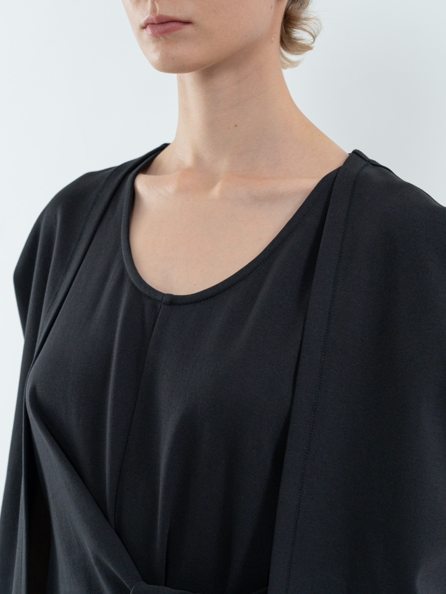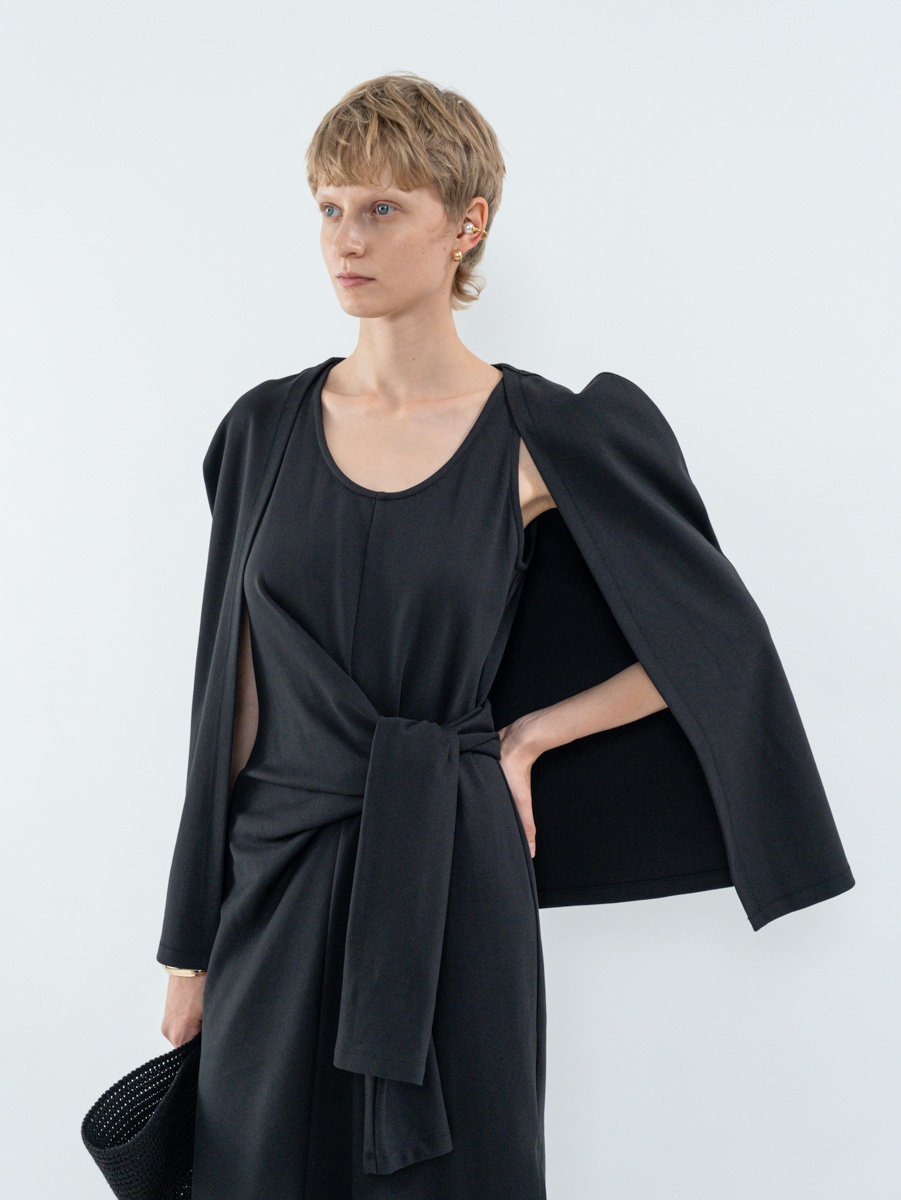 Details 어깨에 미니 스냅을 추가하여 탈부착이 가능한 케이프는 다양한 스타일을 연출할 수 있습니다. 시그니처 디자인으로 장식적인 소매 패널이 특징이며, 베이직한 슬리브리스 드레스 또는 케이프와 함께 연출하여 계절에 맞는 다양한 스타일을 즐길 수 있습니다. - 릴랙스드 핏 - 셀프 타이 웨이스트로 착용자에게 맞는 핏 조절 - 허리 부분을 감싸는 매듭 디테일 디자인 - 통기성이 좋은 면 저지 소재 Fabric & Care - 코튼 100% - 제품 형태 유지를 위하여 드라이크리닝을 권장합니다. Size and measurements - International sizing - 모델은 171cm이고 M 사이즈를 착용하였습니다. 사이즈는 둘레 기준으로 재는 위치에 따라 ±3cm 정도 오차가 생길 수 있습니다.