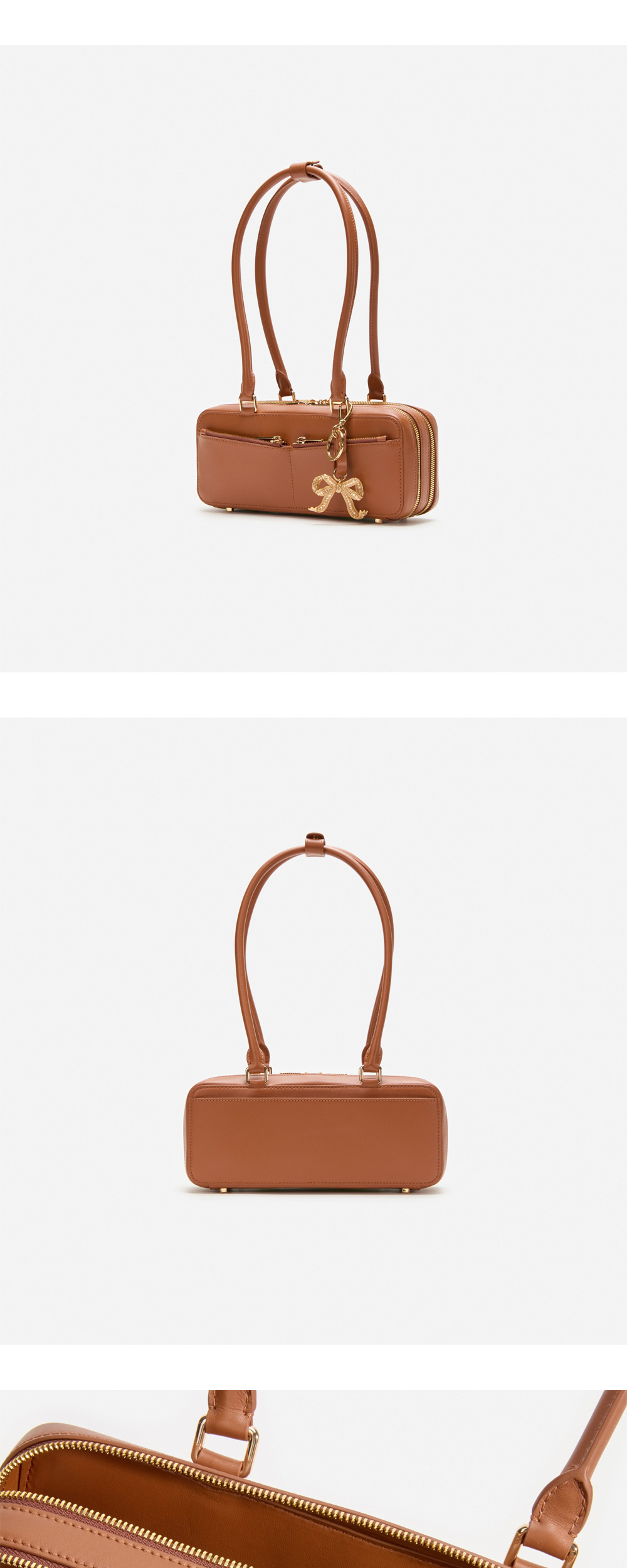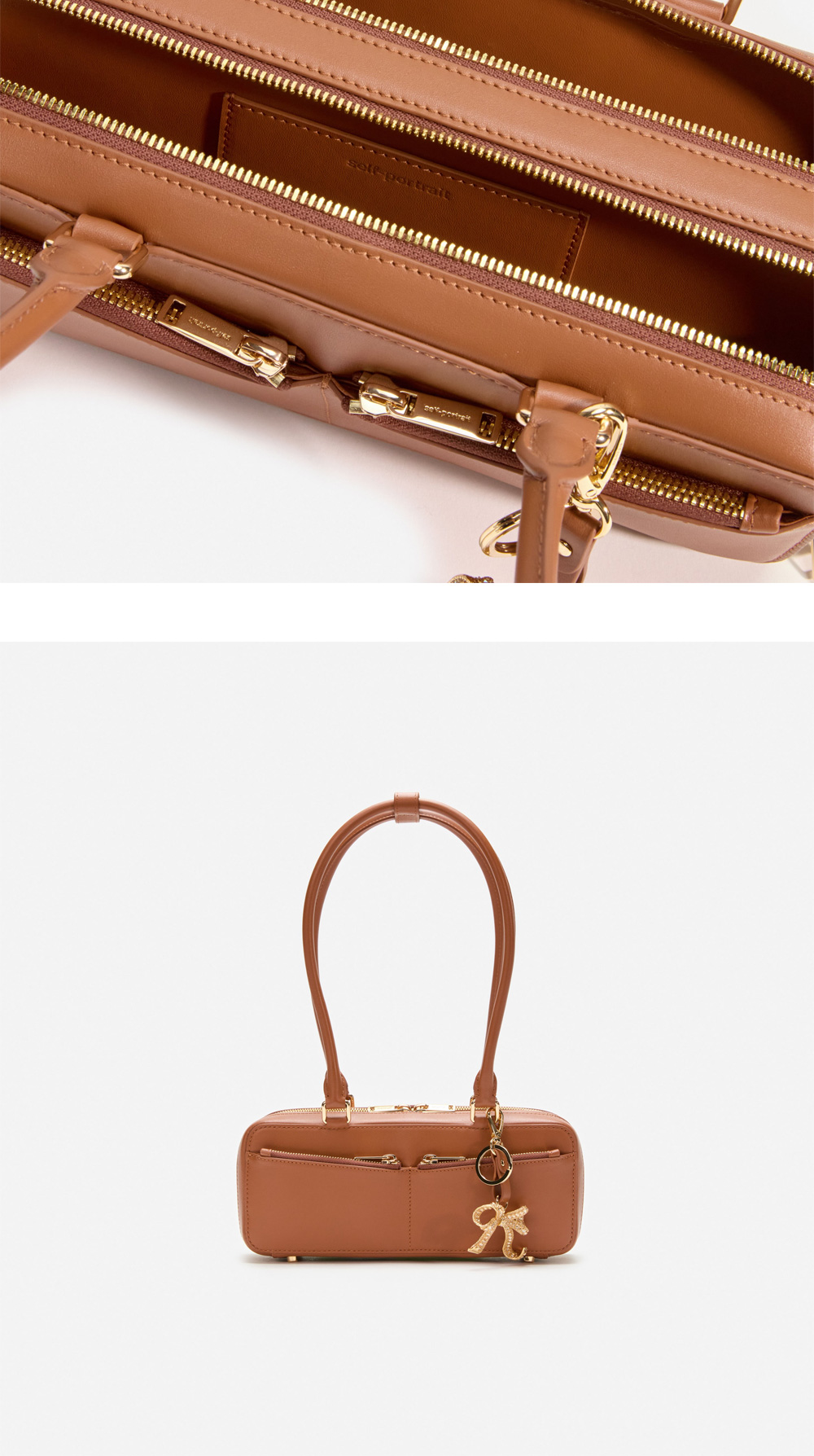 클래식한 셀프 포트레이트 우먼 레더 바게트 숄더 백 위드 참 탄 입니다. - 겉감 소가죽 - 지퍼 잠금 - 앞면 포켓 - 탈부착 가능한 리본 장식