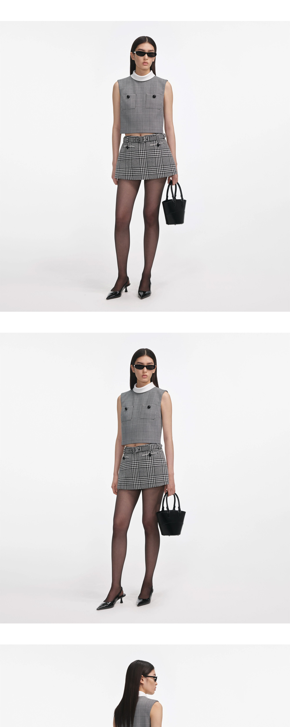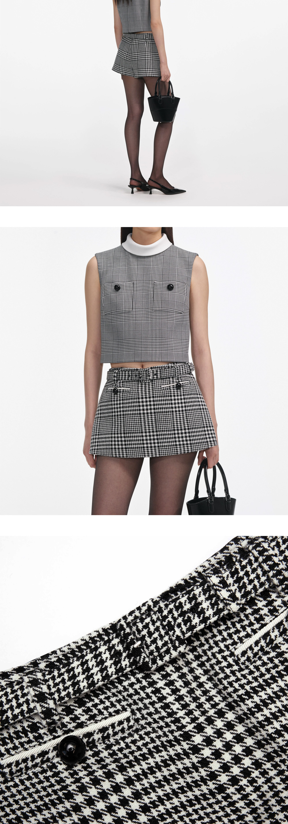 하운드투스 울 소재의 셀프 포트레이트 우먼 하운드투스 미니 스커트 블랙 앤 화이트입니다. - 핏한 스타일 - 신축성이 거의 없음 - 옆면 지퍼 - 탈부탁 가능한 벨트