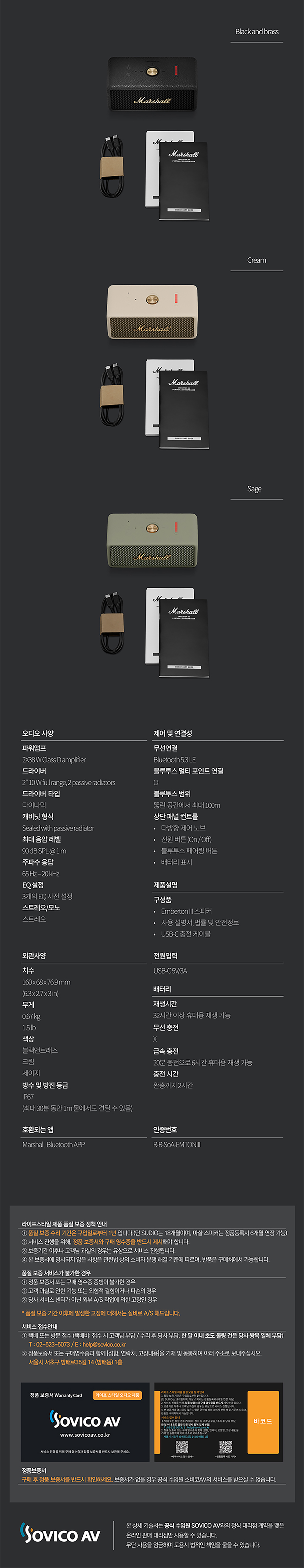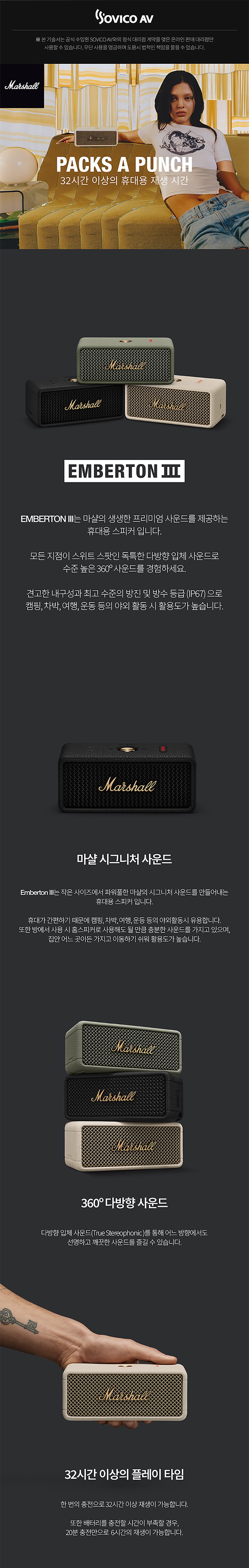 Emberton III는 Marshall의 생생한 프리미엄 사운드를 제공하는 휴대용 스피커이며 모든 지점이 스위트 스팟인 독특한 다방향 입체 사운드로 수준 높은 360° 사운드를 경험 할 수 있고 견고한 내구성과 최고 수준의 방진 및 방수 등급(IP67)로 캠핑, 여행, 운동 등의 야외 활동 시 활용도가 높습니다.
