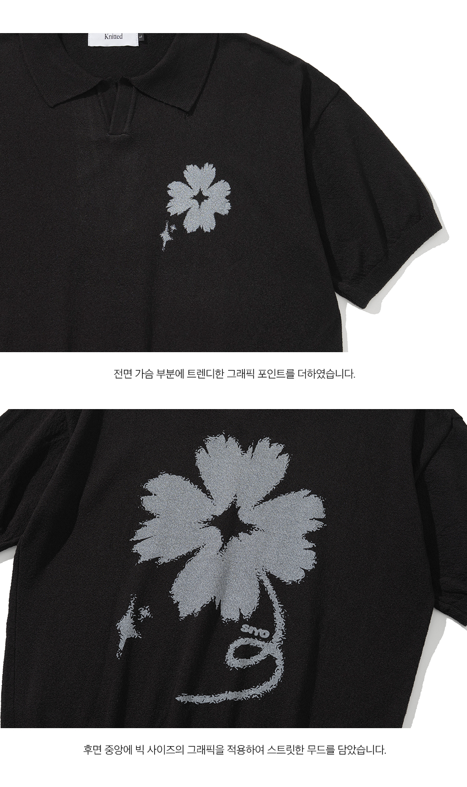 흡한속건 기능의 원단으로 제작되어 몸에 달라붙지 않아 한여름에도 쾌적하게 착용 가능한 반팔 니트입니다. 시연의 사인에 담겨있는 네잎클로버를 리디자인한 그래픽 나염으로 유니크한 무드를 더했습니다. 드롭된 어깨 라인으로 자연스러운 실루엣을 연출해 주며 베이직한 오픈카라 디자인이지만 전후면의 그래픽으로 단품 착용만으로도 포인트가 되어줍니다.