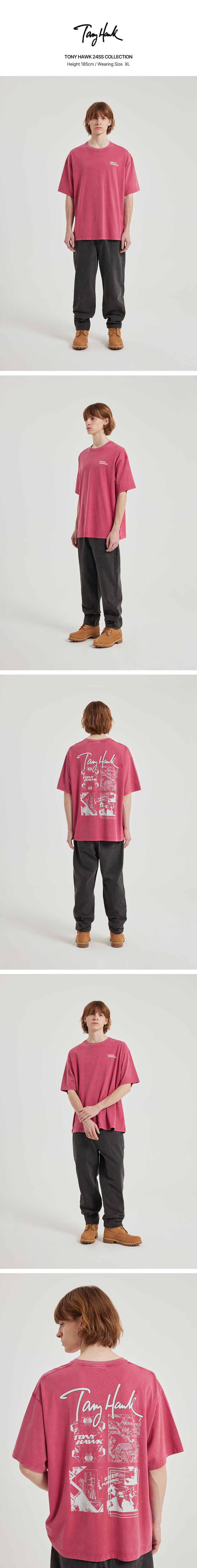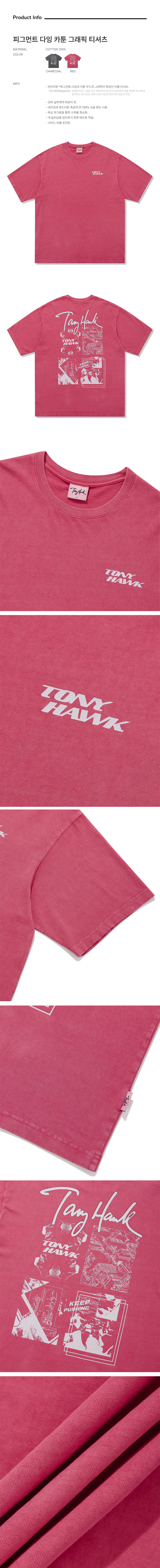 토니호크 피그먼트 다잉 카툰 그래픽 티셔츠 레드