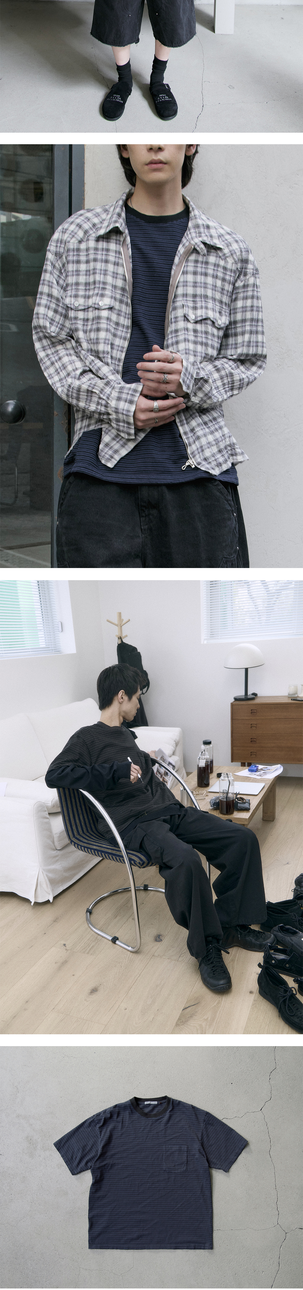 human striped pocket 1/2 t-shirt - 부드러운 촉감의 코튼 티셔츠 - 2가지 두께의 얇은 스트라이프 패턴 - 넉넉하되 루즈하게 떨어지는 실루엣 - 가먼트 워싱 및 어깨 체인스티칭 *모델1: 180 초반 / 마른 체형, 3사이즈 착용 *모델2: 170 후반 / 마른 체형, 3사이즈 착용 *가먼트 다잉 제품 특성상 생산 차수마다 색감이 조금씩 변경 될 수 있습니다. *다만 금번 차수 경우, 전 차수와의 색감차가 극히 미약해 별도 차이점은 코멘트 없이 발매 됩니다. 본 제품은 직전 차수와 유사한 실측 및 착용감으로 제작되었습니다. 기존 동일 제품을 착용해보신 고객의 경우, 동일 사이즈 선택 시 적합한 핏으로 착용이 가능합니다. 정확한 상세 사이즈의 경우, 실측표 확인 부탁드립니다.