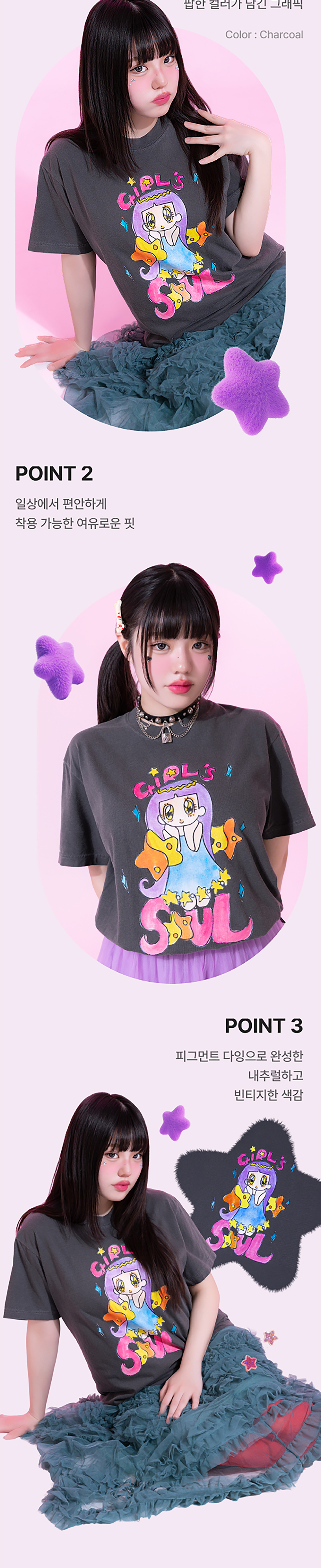 2024년 깜짝 등장하여 여러 K-POP 아티스트의 착용으로 소녀들에게 사랑받고있는 SOUL PUSSSYCAT®의 걸스 브랜드 SOULGIRL®의 여덟번째 티셔츠입니다. KREAM DRAW를 통해 최초 공개되는 이번 소울걸 티셔츠는 소울걸 특유의 아기자기한 걸스 캐릭터에 Girl's Soul 슬로건을 함께 담았으며, 피그먼트 다잉 원단으로 특별 제작되어 보다 빈티지하고 내추럴한 느낌으로 만나보실 수 있습니다.