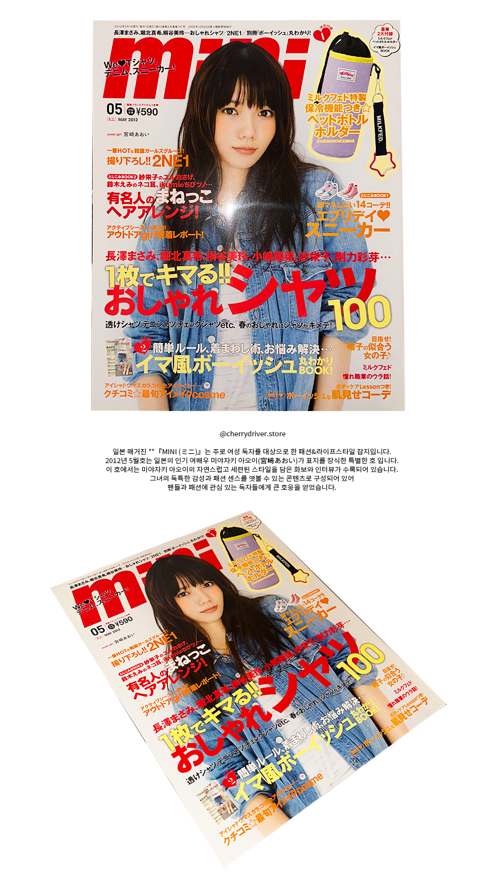 @cherrydriver.store 일본 매거진 **『MINI (ミニ)』는 주로 여성 독자를 대상으로 한 패션&라이프스타일 잡지입니다. 2012년 5월호는 일본의 인기 여배우 미야자키 아오이(宮崎あおい)가 표지를 장식한 특별한 호 입니다. 이 호에서는 미야자키 아오이의 자연스럽고 세련된 스타일을 담은 화보와 인터뷰가 수록되어 있습니다. 그녀의 독특한 감성과 패션 센스를 엿볼 수 있는 콘텐츠로 구성되어 있어 팬들과 패션에 관심 있는 독자들에게 큰 호응을 얻었습니다.