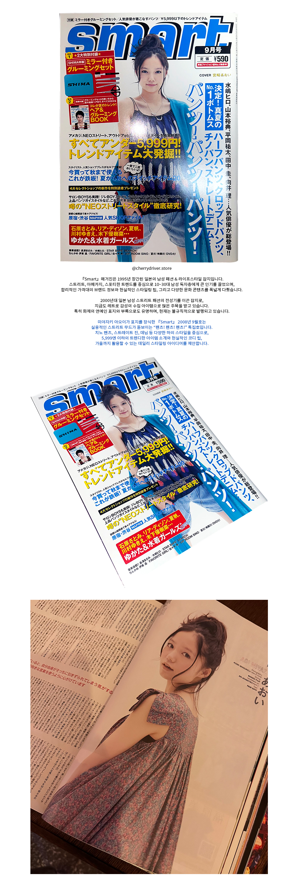 @cherrydriver.store 미야자키 아오이가 표지를 장식한 『Smart』 2008년 9월호는 실용적인 스트리트 무드가 돋보이는 “팬츠! 팬츠! 팬츠!” 특집호입니다. 치노 팬츠, 스트레이트 진, 데님 등 다양한 하의 스타일을 중심으로, 5,999엔 이하의 트렌디한 아이템 소개와 현실적인 코디 팁, 가을까지 활용할 수 있는 데일리 스타일링 아이디어를 제안합니다.