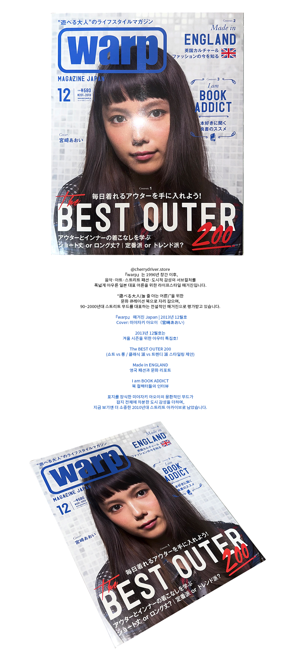 @cherrydriver.store 『warp』는 1996년 창간 이후, 음악·아트·스트리트 패션·도시적 감성의 서브컬처를 폭넓게 아우른 일본 대표 어른을 위한 라이프스타일 매거진입니다. “遊べる大人(놀 줄 아는 어른)”을 위한 문화 큐레이션 북으로 자리 잡으며, 90~2000년대 스트리트 무드를 대표하는 전설적인 매거진으로 평가받고 있습니다.
