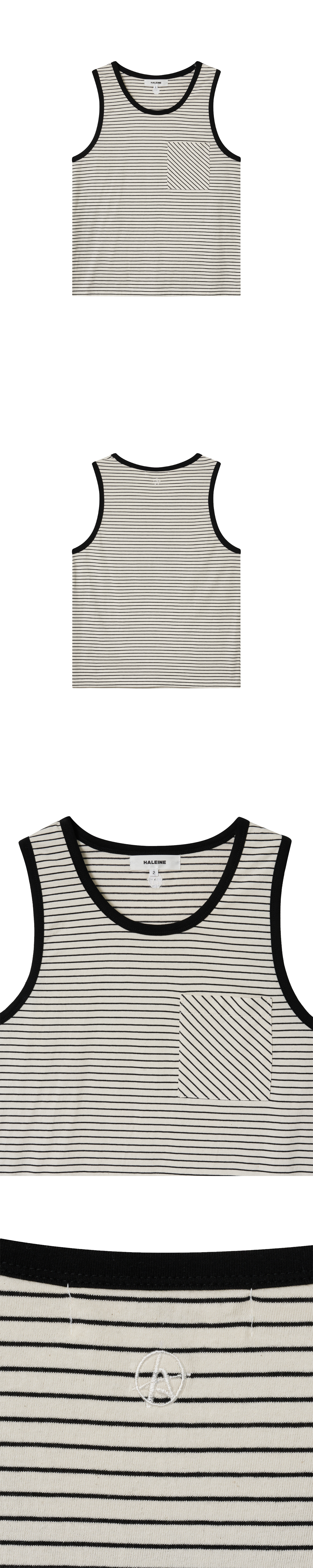 얇은 스트라이프 패턴의 코튼 저지 원단으로 제작된 슬리브리스 탑입니다. 넥라인과 암홀에는 배색 링거 디테일이 더해져 클래식하면서도 캐주얼한 무드를 연출합니다. 포켓에는 바이어스 처리된 동일 원단을 사용해 섬세한 디테일을 더했습니다. 단독 착용은 물론, 이너 레이어드 아이템으로도 활용하기 좋습니다. - DETAIL - 스쿱넥 뒷면 로고 자수 스트라이프 패턴 넥라인 및 암홀 배색 마감 바이어스 처리된 포켓 -model- 186cm / 가슴둘레 86cm / 허리둘레 71cm / 엉덩이둘레 91cm - 1사이즈 착용