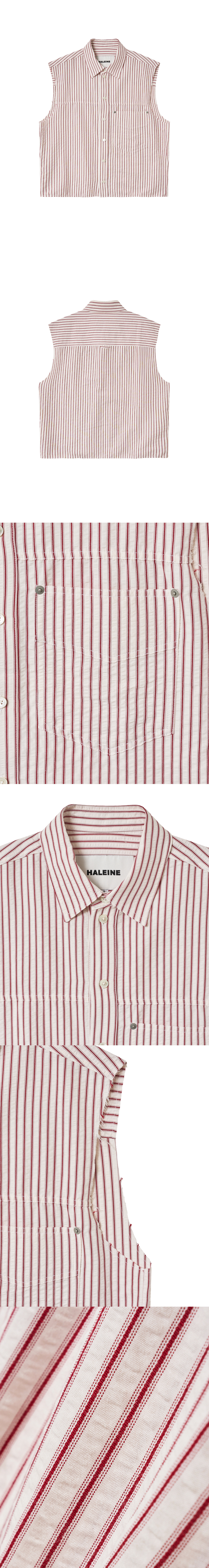 스트라이프 셔츠의 클래식한 분위기를 바탕으로, 슬리브와 밑단을 컷팅 처리해 러프한 무드를 더한 슬리브리스 셔츠입니다. 암홀과 밑단은 마감 없이 컷오프 상태로 완성되어 자연스럽게 드러나는 올풀림이 특징이며, 단독 또는 다양한 이너와의 레이어링으로 활용 가능합니다. 얇고 드라이한 촉감의 코튼 혼방 원단을 사용해 한여름에도 쾌적하게 착용할 수 있으며, 세로 스트라이프 패턴이 전체 실루엣을 보다 정돈된 인상으로 마무리합니다. 과하지 않게 변형된 클래식 셔츠의 변주로, 데일리 웨어에 자연스럽게 녹아드는 아이템입니다. -DETAIL- 레귤러 핏 플랩 포켓 형태를 가진 패치 포켓 소매와 밑단 컷오프 디테일 천연 자개 단추 *소매 및 밑단의 경우 자연스럽게 올이 풀리며 하단의 봉제선 이상은 풀리지 않습니다* -model- 186cm / 가슴둘레 83cm / 허리둘레 70cm / 엉덩이둘레 90cm - 2사이즈 착용